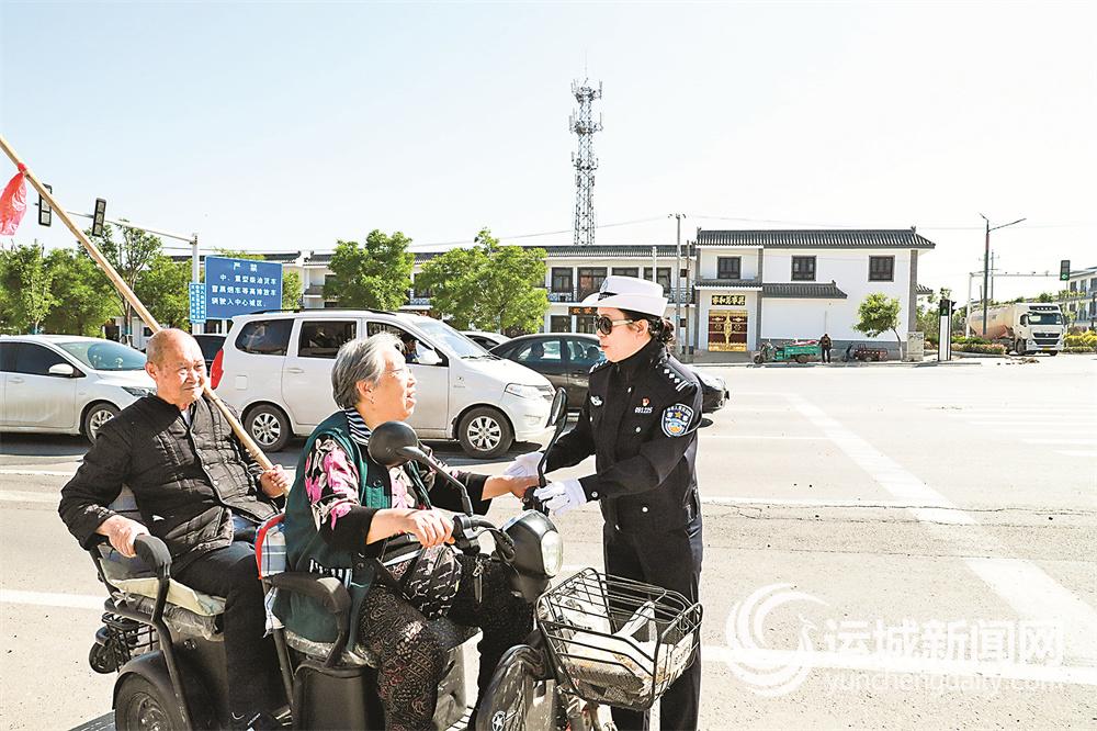盐湖交警大队民警在解放路与南城墙路交叉口疏导交通