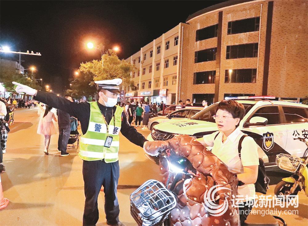 5月2日19时许,从北到南整条长1200余米的盬街被群众围得水泄不通。而此时,还有不少市民、游客从八方汇聚于此。在距离盬街500米左右的红旗街与解放路交叉口,正是交通管控的主要路口。在夜色下,川流不息的车辆、行人频频将民警执勤的身影挡住,却没能挡住清脆响亮又急促的哨声。顺着声音,记者见到早已在此执勤的盐湖交警大队民警。他们一次次挥手、一声声哨响,疏导着过往车辆和行人。