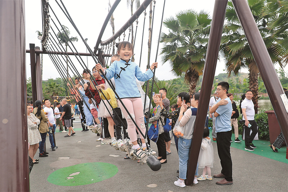 “五一”假期,众多家长带着孩子来到重庆市璧山区枫香湖儿童公园,体验园区种类多样的休闲运动项目,愉快度假。 新华社发(游青 摄)