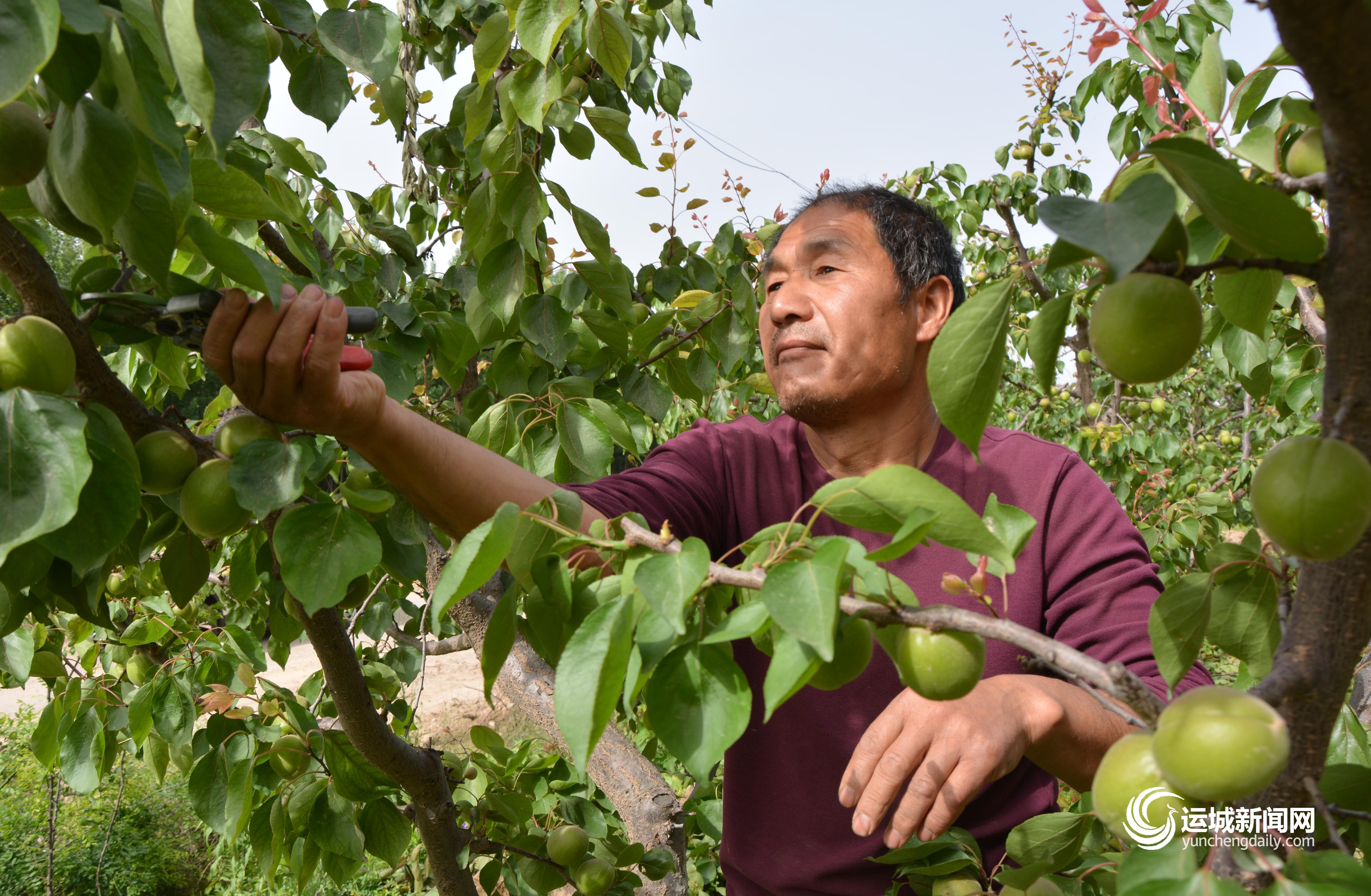 5月9日,芮城县风陵渡镇西王村村民在地里疏剪杏树枝条。西王村地理位置特殊,早熟杏一般在5月中下旬即可上市。目前,当地村民正抓紧时间疏剪杏树枝条,确保甜杏通风透光,及早成熟上市。