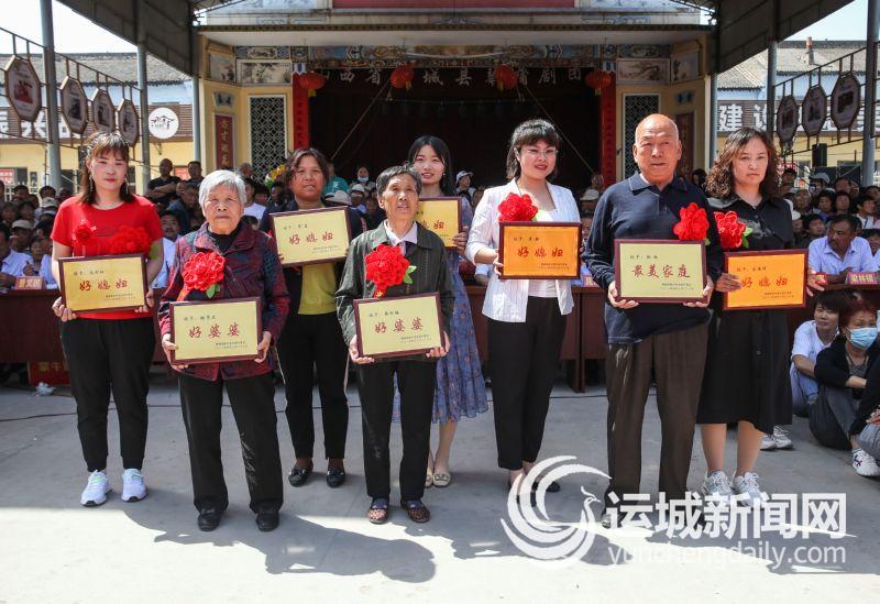 5月9日,稷山县稷峰镇姚村“最美家庭”代表和“好媳妇”“好婆婆”展示奖牌。