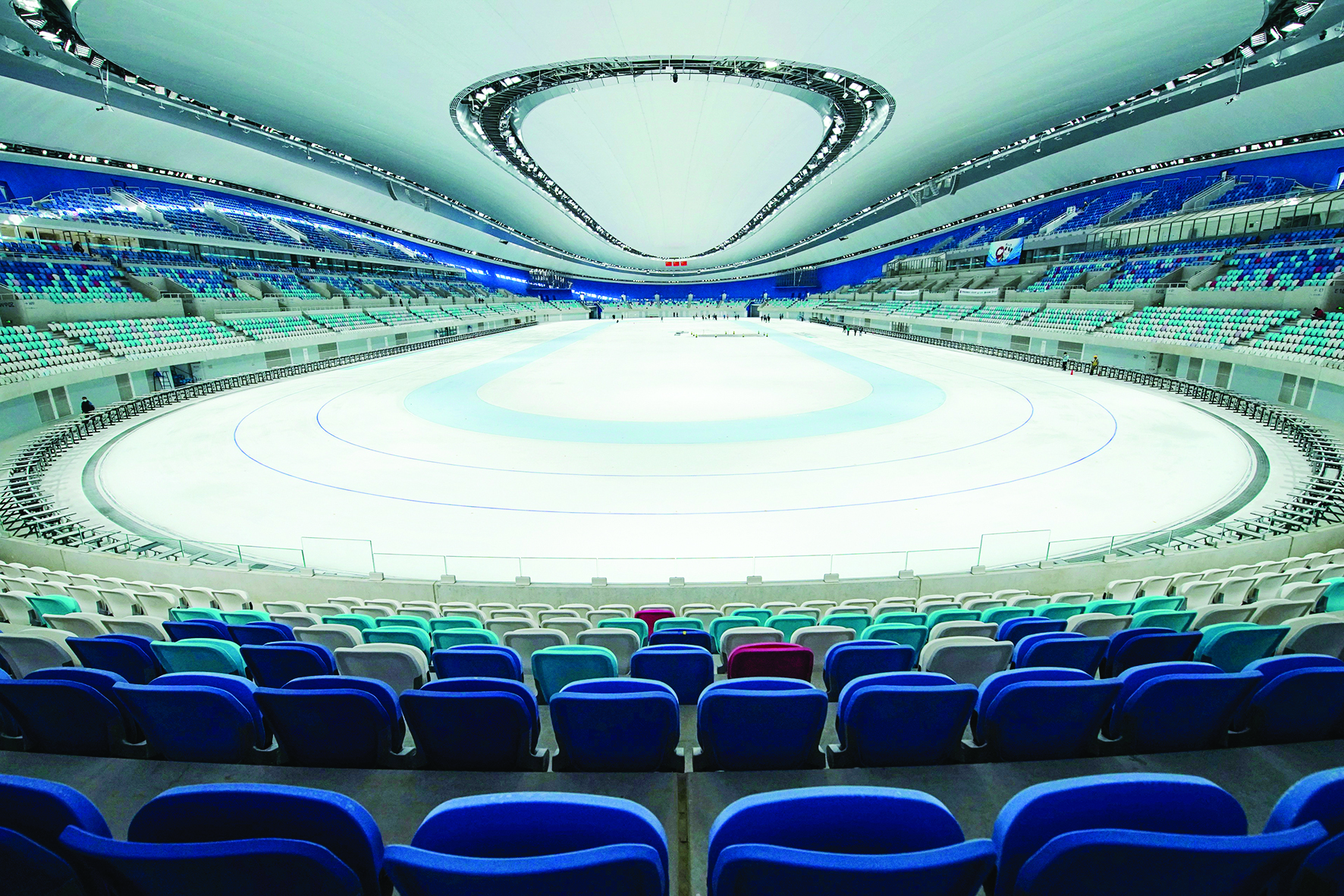 这是5月8日拍摄的国家速滑馆冰面。 近日,北京冬奥会标志性场馆国家速滑馆“冰丝带”开展首次全冰面制冰,规模约1.2万平方米的场馆全冰面成功亮相。 新华社记者 张晨霖 摄