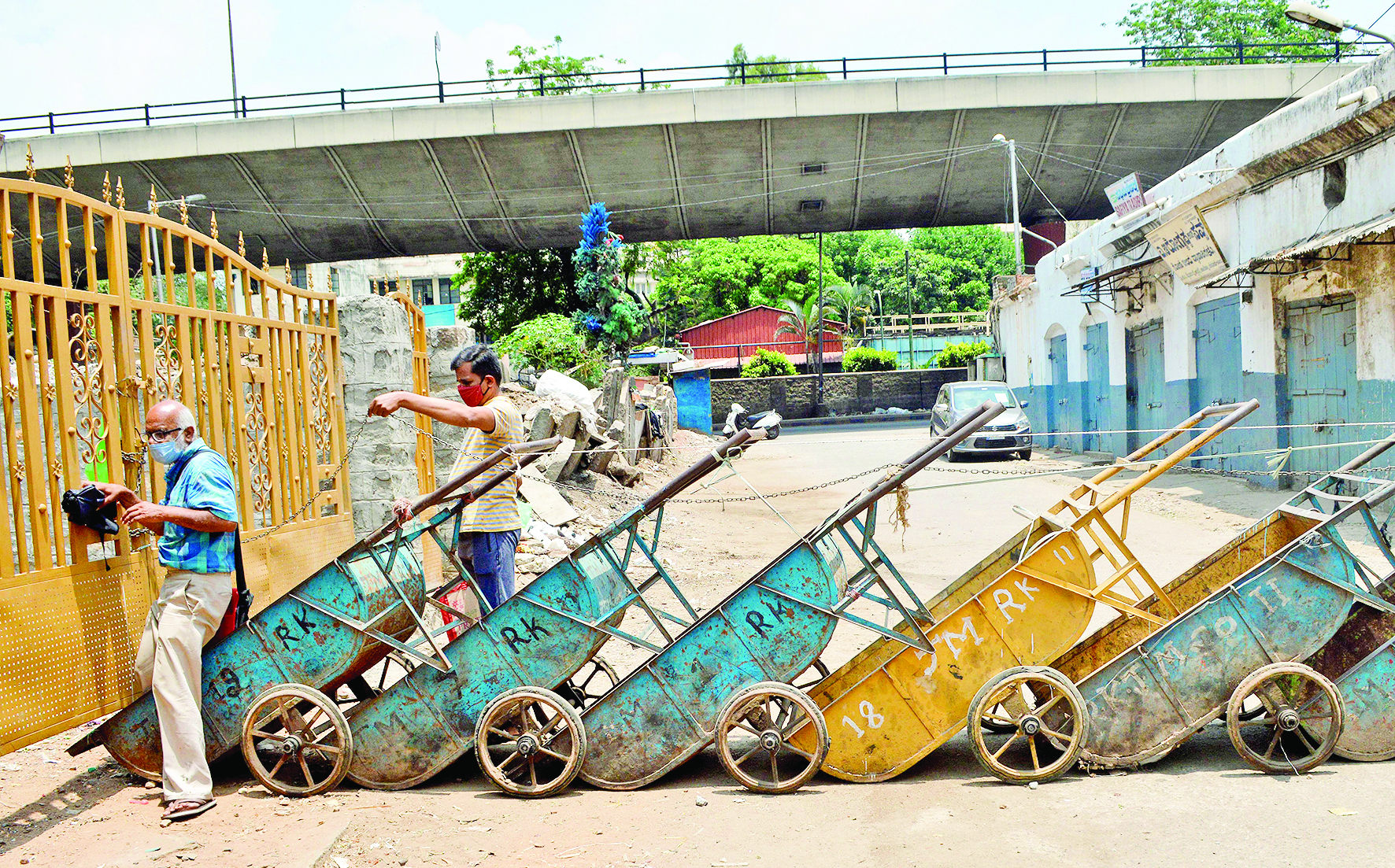▲5月10日,印度卡纳塔克邦首府班加罗尔一条道路被路障封锁。 由于疫情不断恶化,印度多地收紧疫情防控措施。印度卡纳塔克邦首府班加罗尔现存新冠确诊病例超过30万例,全国最多。当地新冠病毒检测阳性结果比例超过30%。 新华社发