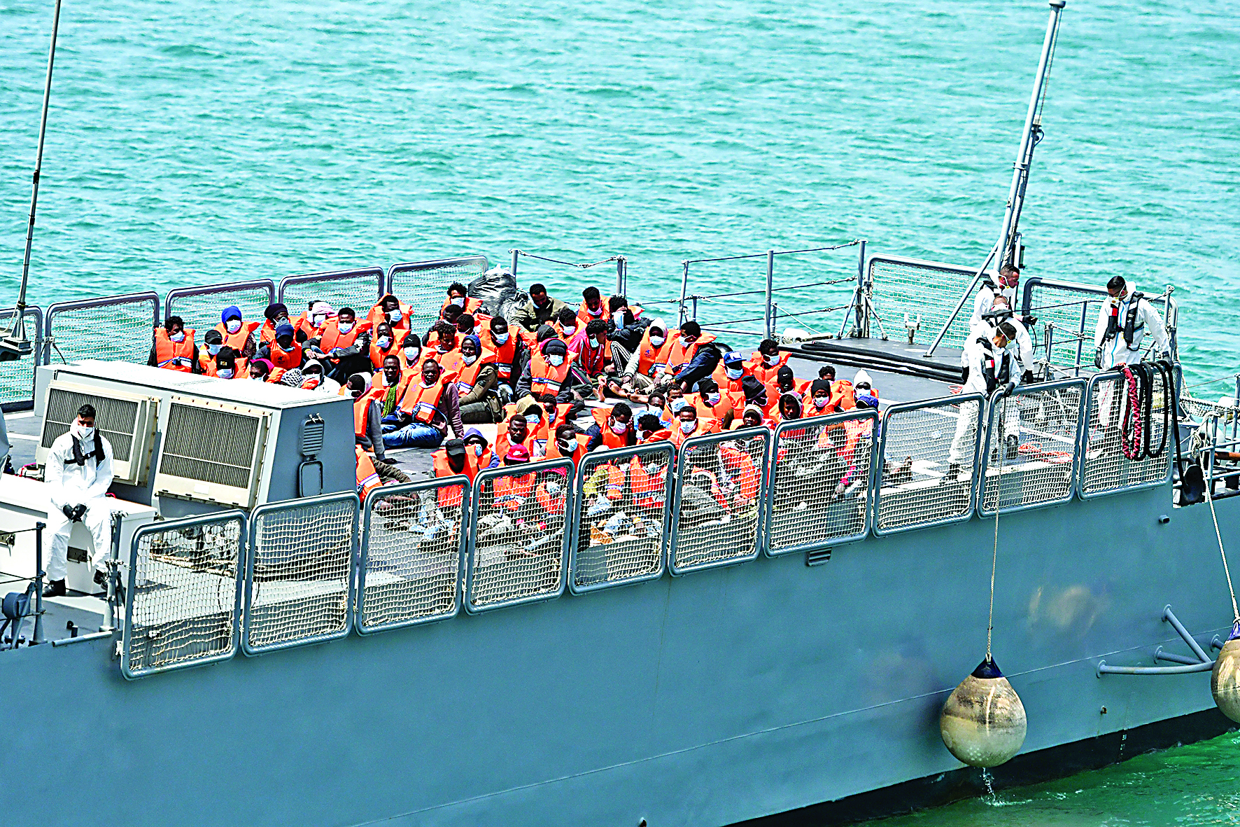 ▲5月11日,被马耳他执法人员救出的非法移民抵达马耳他森格莱阿。