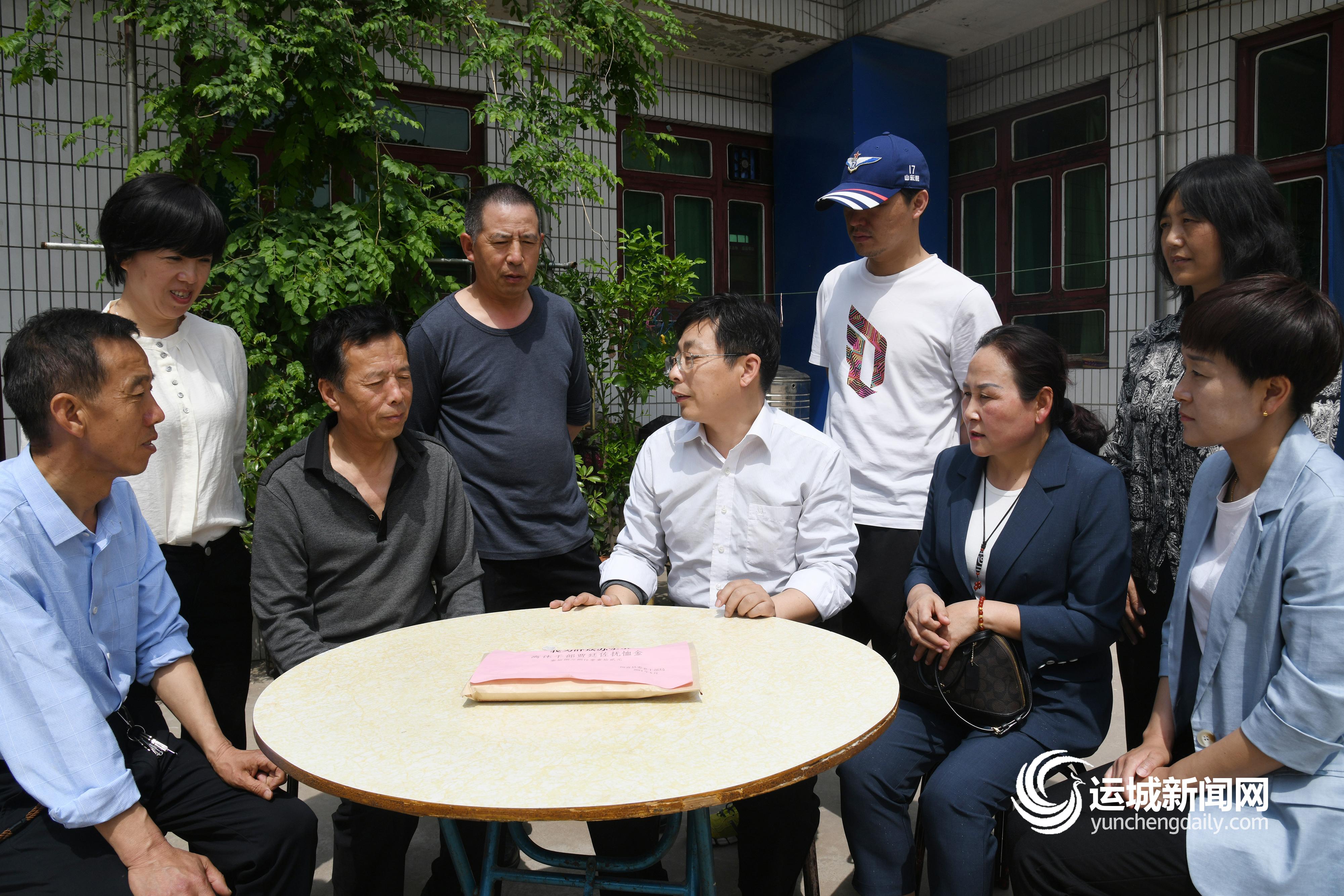 5月12日,闻喜县委老干部局工作人员上门为已故离休干部贾廷佐家人送去抚恤金。