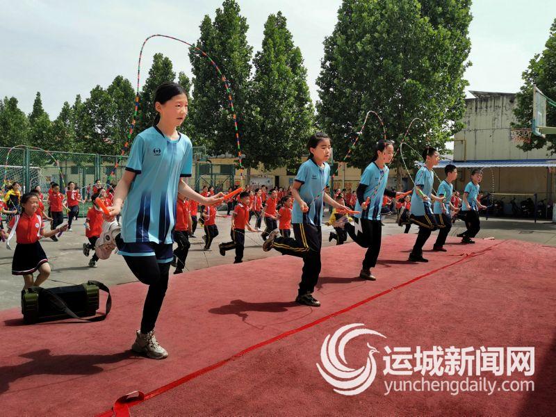 5月12日,临猗县崇相西小学学生在宽阔的操场上进行花样跳绳训练。