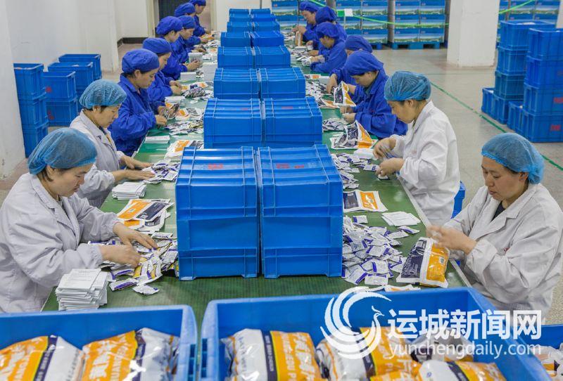 ▲5月13日,万荣县华康药业股份有限公司的工人,将生产的中成药装袋、装箱。