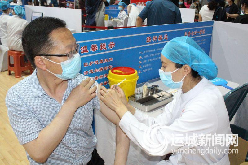 ▲5月13日,闻喜县居民在该县体育馆方舱接种点接种新冠疫苗。