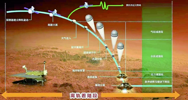 5月15日凌晨1时许,天问一号探测器在停泊轨道实施降轨,机动至火星进入轨道。4时许,着陆巡视器与环绕器分离。历经约3小时飞行后,进入火星大气,经过约9分钟的减速、悬停避障和缓冲,成功软着陆于火星乌托邦平原南部预选着陆区。