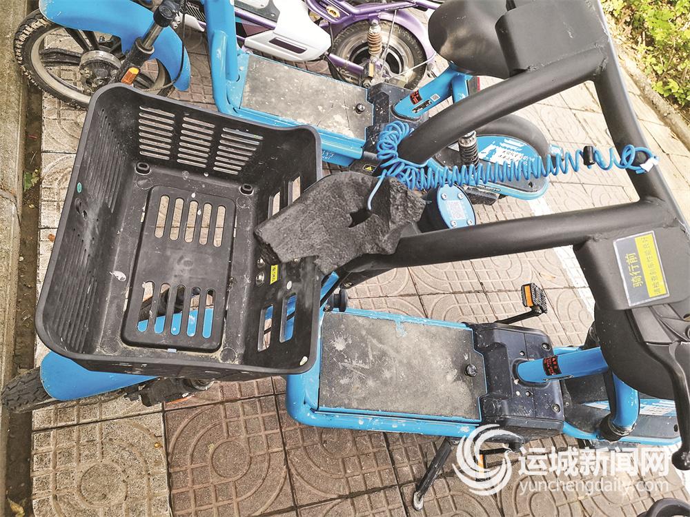 在走访河东街、周西路、红旗街、人民路、解放路、凤凰路、双桥路等街道的共享电动车停放点,记者发现,停放的“小蓝”有的脚蹬板不见了踪影,有的链条被损坏脱落,有的头盔丢失,有的座椅被划破,有的挡泥板被拆掉……