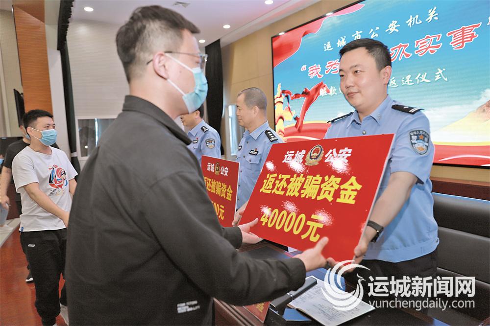 “前期我都觉得没希望了,没想到民警同志这么努力,夜以继日帮我把这些钱追回来了。非常感谢民警的辛苦付出。”“真是太感谢了。没想到你们不但抓住了骗子,还帮我挽回了损失。”……当天涉案财物发还仪式上,36名受害群众陆续从民警手中接过价值共计354.96万元涉案财物后,纷纷为公安民警的辛勤付出点赞。