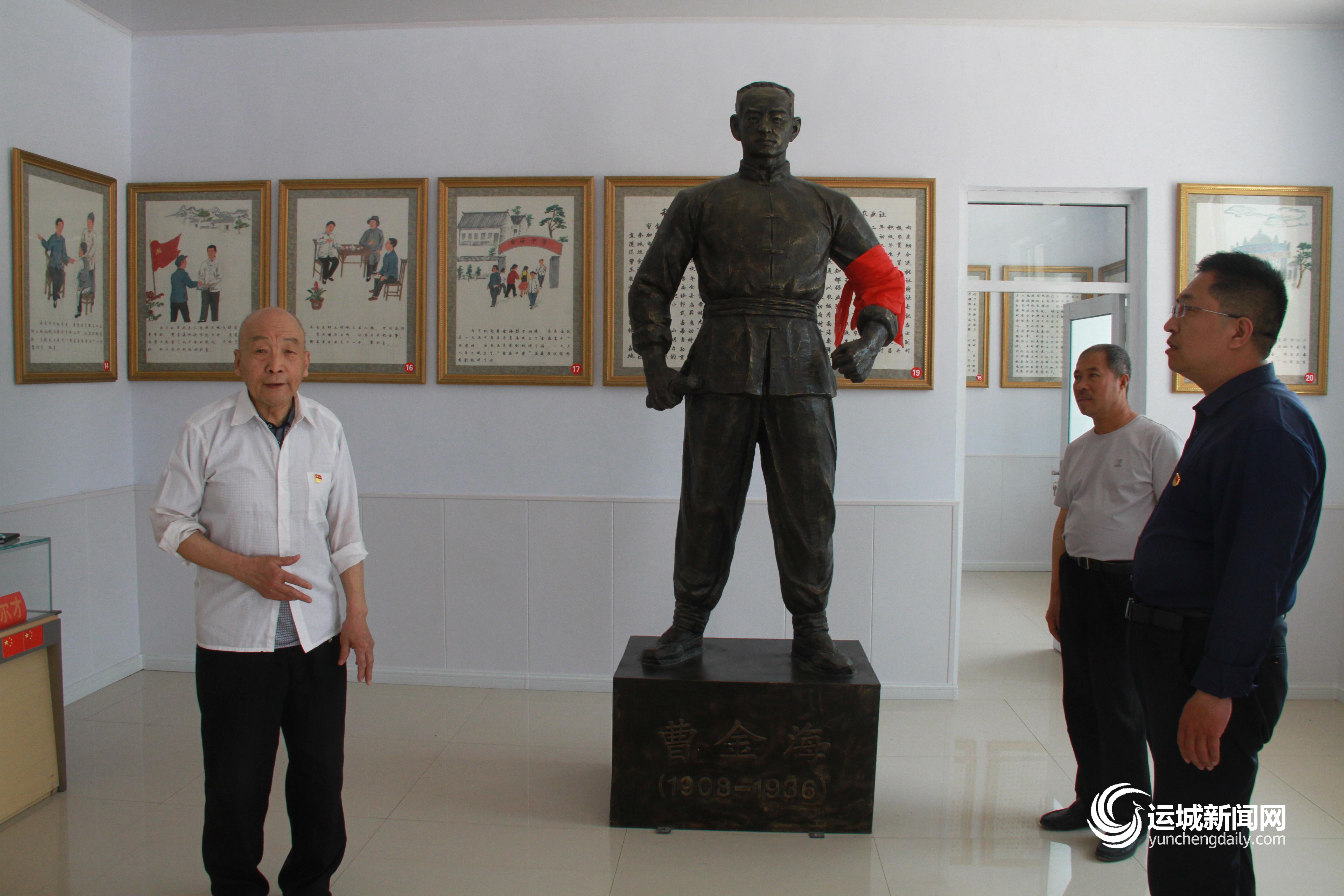 如今,在位于郇王村党群服务中心2楼的曹金海烈士纪念馆内,高大的曹金海烈士塑像矗立在纪念馆中央。曹金海的塑像及展板上的画像,是郇王村“两委”在2018年邀请临猗农民画家姚六丰,根据该村时年95岁的樊钟灵老人的描述绘制出来的。