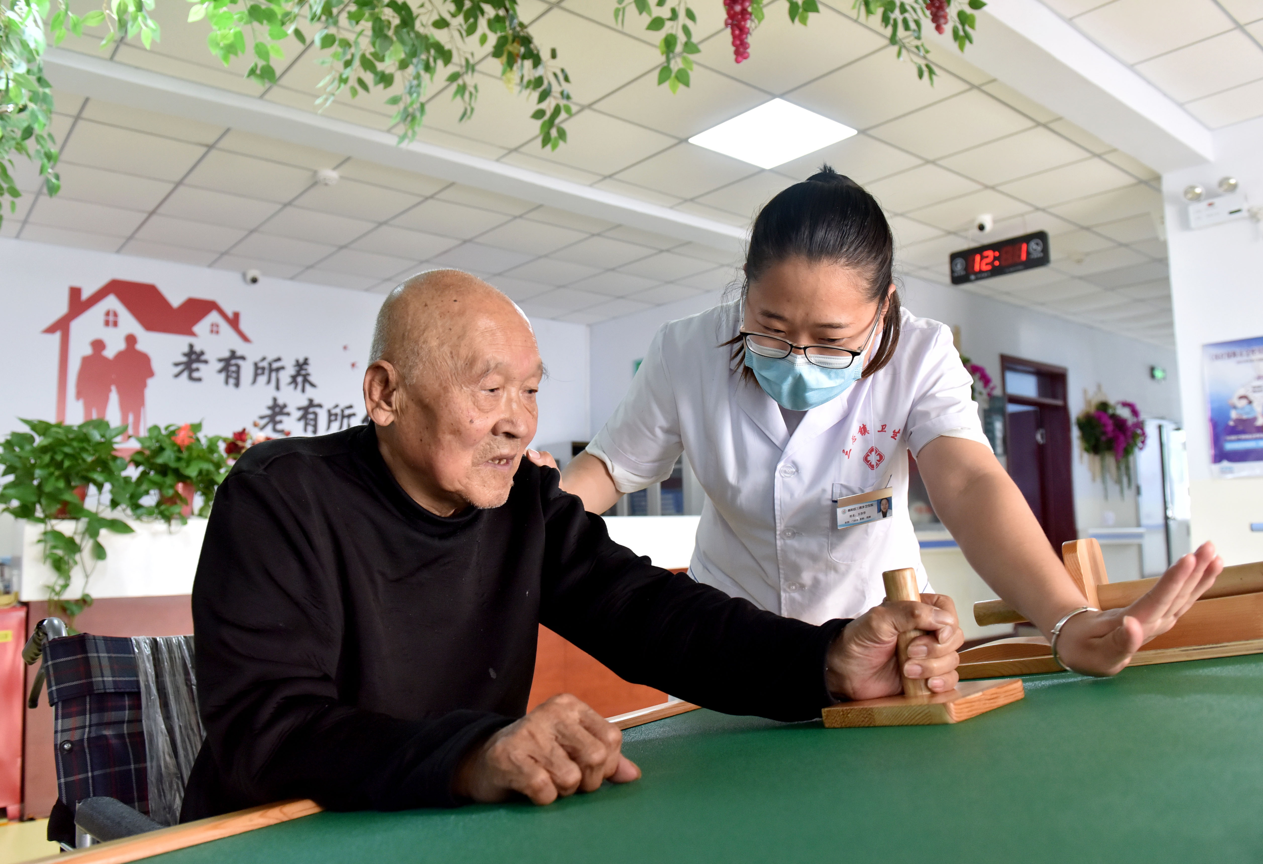 5月25日,河北省邢台市南和区三思镇卫生院医养中心医务人员指导老人进行康复训练。 近年来,河北省邢台市南和区探索“医养结合”养老模式,整合养老和医疗两方面资源,推动养老机构和医疗机构以协作或并建方式进行合作,打造融医疗、康复、护理、养老于一体的的医养综合体,为老人提供持续、针对性的照料服务。 新华社记者 朱旭东 摄