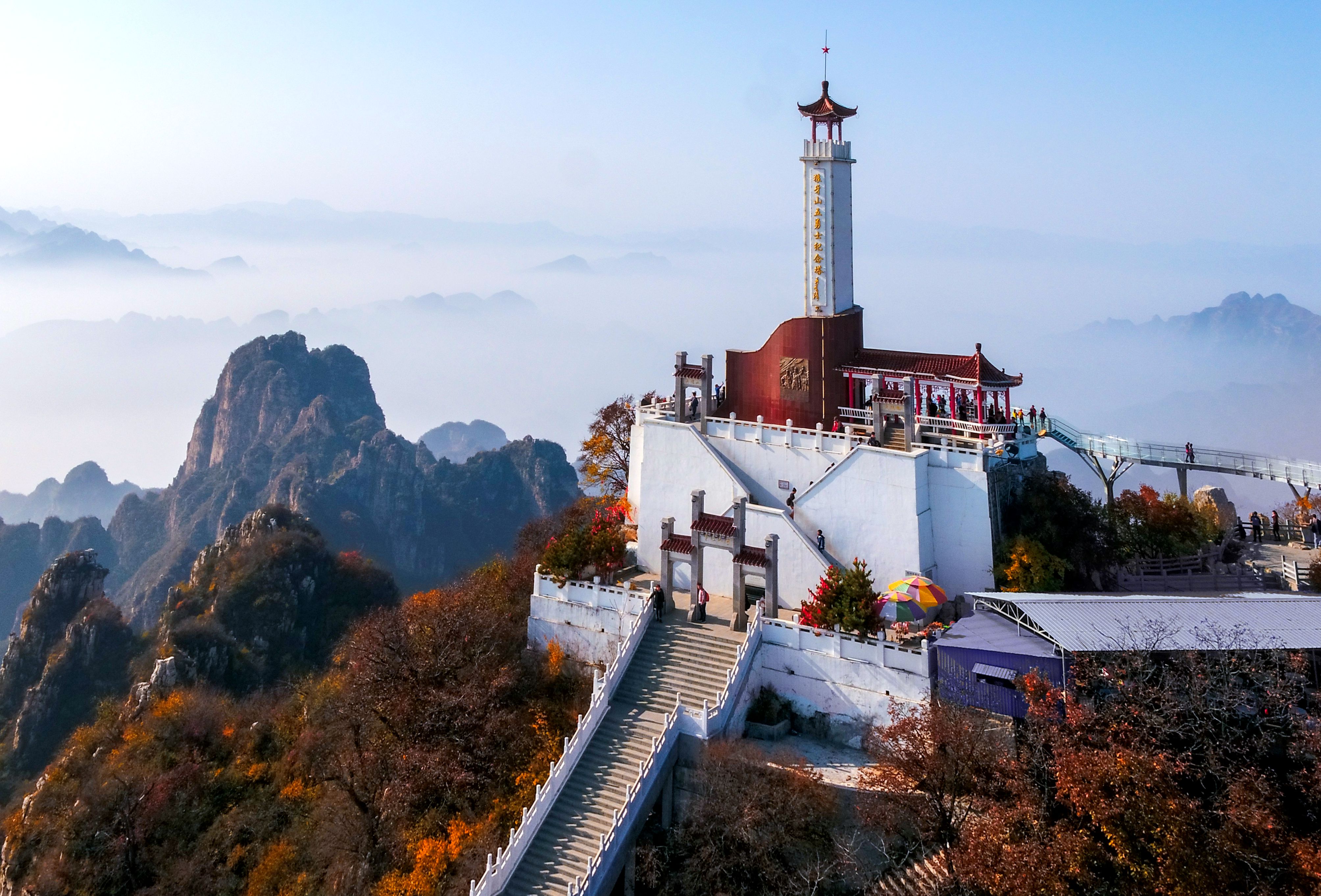 ▲狼牙山棋盘陀峰顶的“狼牙山五勇士纪念塔”(2017年10月27日摄) 新华社发