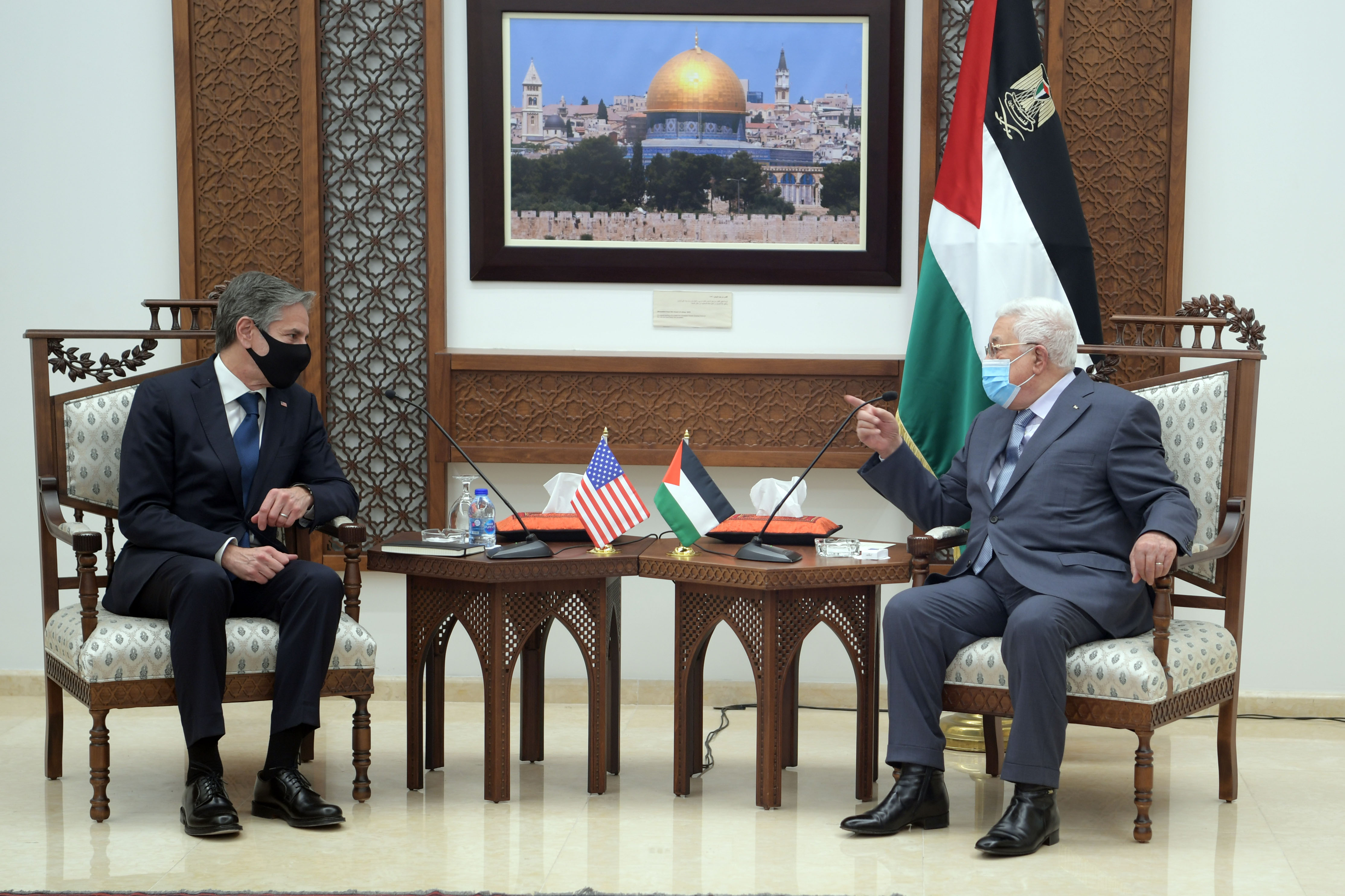 ▲5月25日,巴勒斯坦总统阿巴斯(右)与到访的美国国务卿布林肯在拉姆安拉会晤。 美国国务卿布林肯25日晚在巴勒斯坦拉姆安拉说,美国将重开驻耶路撒冷总领事馆,称“美国致力于重建与巴勒斯坦民族权力机构和巴勒斯坦人民的关系”。