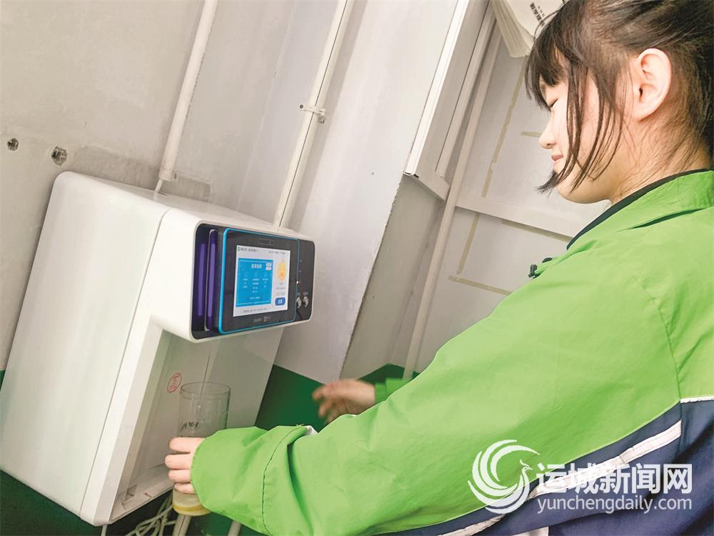 5月19日,高二学生薛佳滢在班级内的饮水机进行刷脸接水。她说:“之前接饮用水是固定的价格、固定的水量,现在可以根据饮水量来接水,喝多少打多少,既省水又省钱,很方便。”