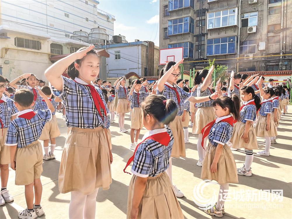 运城晚报讯(记者 王露)5月26日,盐湖区解放路第一小学开展了“红领巾 心向党”少先队入队仪式,切实增强少先队员的光荣感、使命感,培养少先队员爱党、爱国的情怀。当天,一年级163名学生光荣加入了少先队组织。 伴随着响亮的国歌声,五星红旗冉冉升起,入队仪式正式开始,全体师生肃立致敬,用嘹亮的歌声表达对党、对祖国的崇敬与热爱之情;少先队员们心潮澎湃,鲜艳的队旗迎风飘扬,嘹亮的队歌唱出队员们炽热的信仰。学校宣读了新队员名单,对新队员入队表示热烈的祝贺,同学们静心聆听,激动万分。紧接着,六年级的老队员为一年级的新队员佩戴红领巾,并在队旗下互敬队礼。队员们精神饱满,个个兴高采烈,激动不已。随后,少先队大队辅导员带领新队员面向队旗庄严宣誓,并宣读聘请一年级中队辅导员的决定;学校为一年级3个中队授予了中队旗,并为辅导员颁发了聘书。