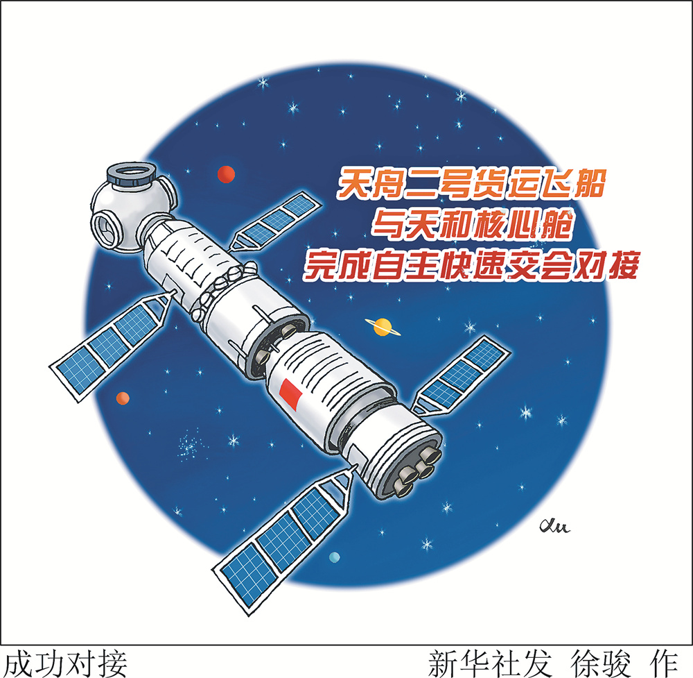 新华社海南文昌5月30日电(记者 黎云 张汨汨)据中国载人航天工程办公室消息,天舟二号货运飞船入轨后顺利完成入轨状态设置,于5月30日5时01分,采用自主快速交会对接模式,精准对接于天和核心舱后向端口,整个过程历时约8小时。