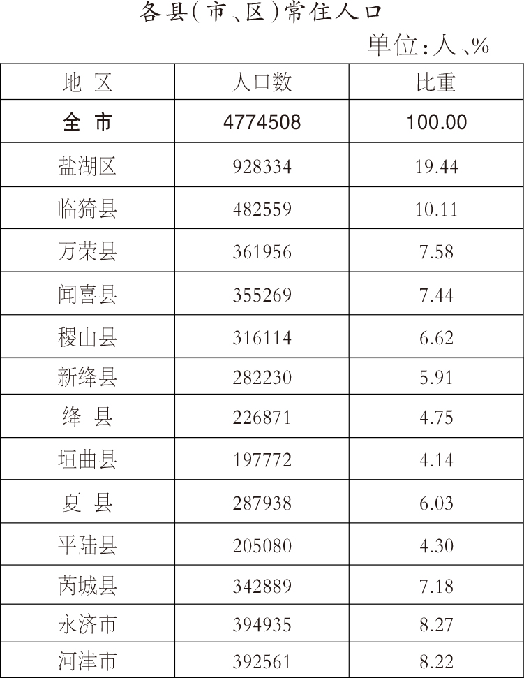 根据《中华人民共和国统计法》《全国人口普查条例》规定和《运城市人民政府关于做好运城市第七次全国人口普查工作的通知》(运政发〔2020〕5号)要求,我市进行了第七次全国人口普查[2]。在市委、市政府的坚强领导下,在各有关部门的大力支持下,在全市各级普查机构和普查人员的共同努力下,在广大普查对象的积极配合下,圆满完成了人口普查主要任务。现将我市常住人口的基本情况公布如下: