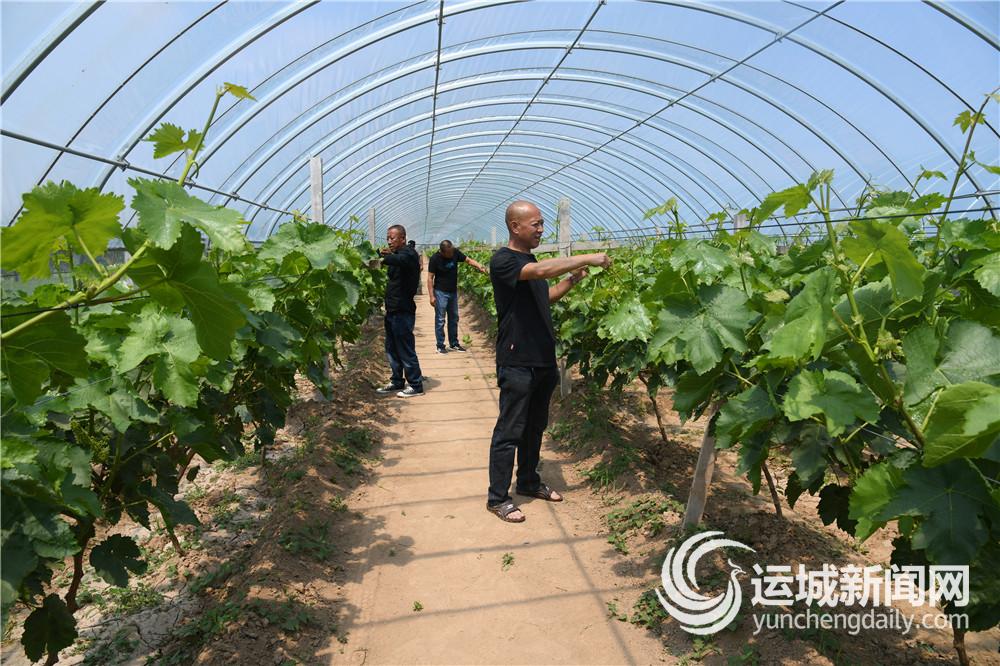 5月28日,闻喜县阳隅镇阳隅村金手指种植专业合作社社员在大棚内管理葡萄苗。