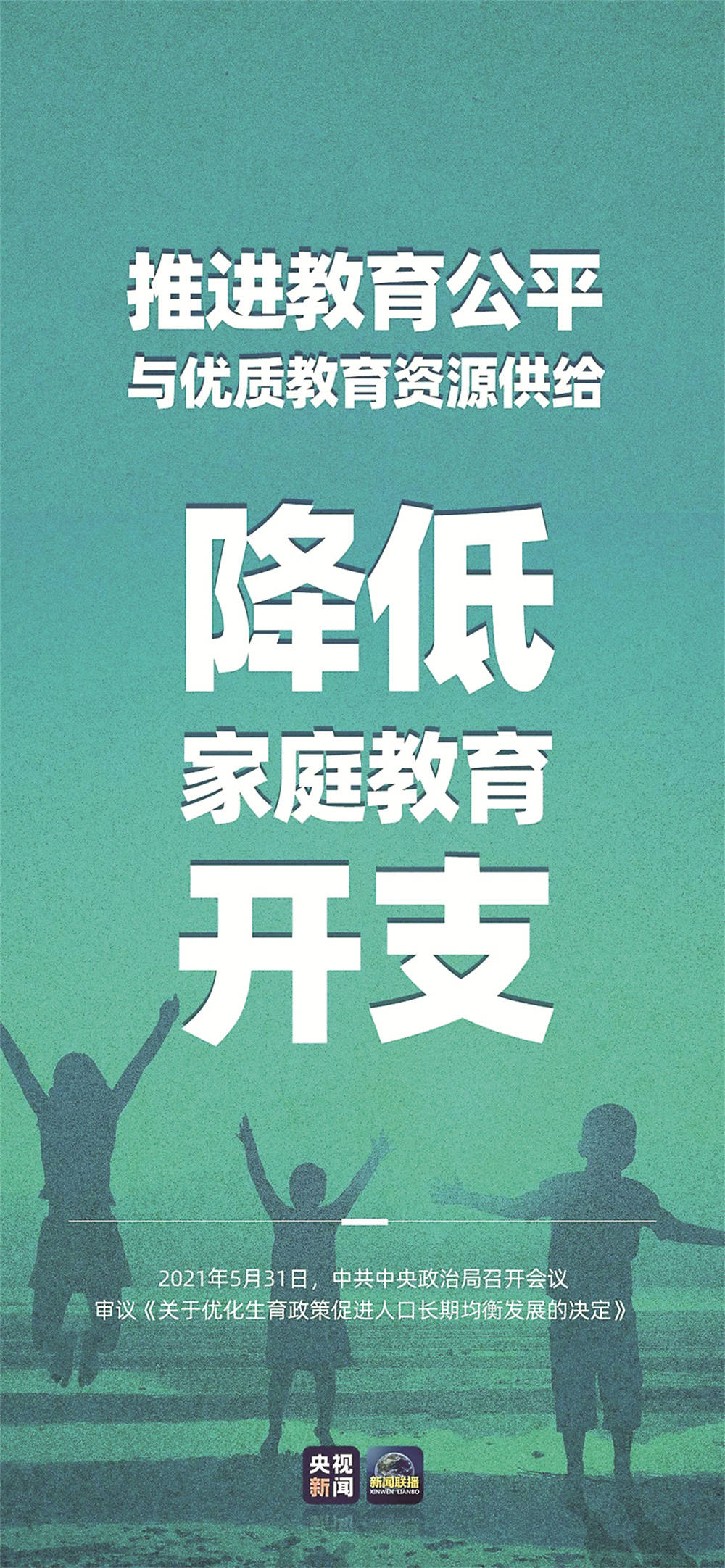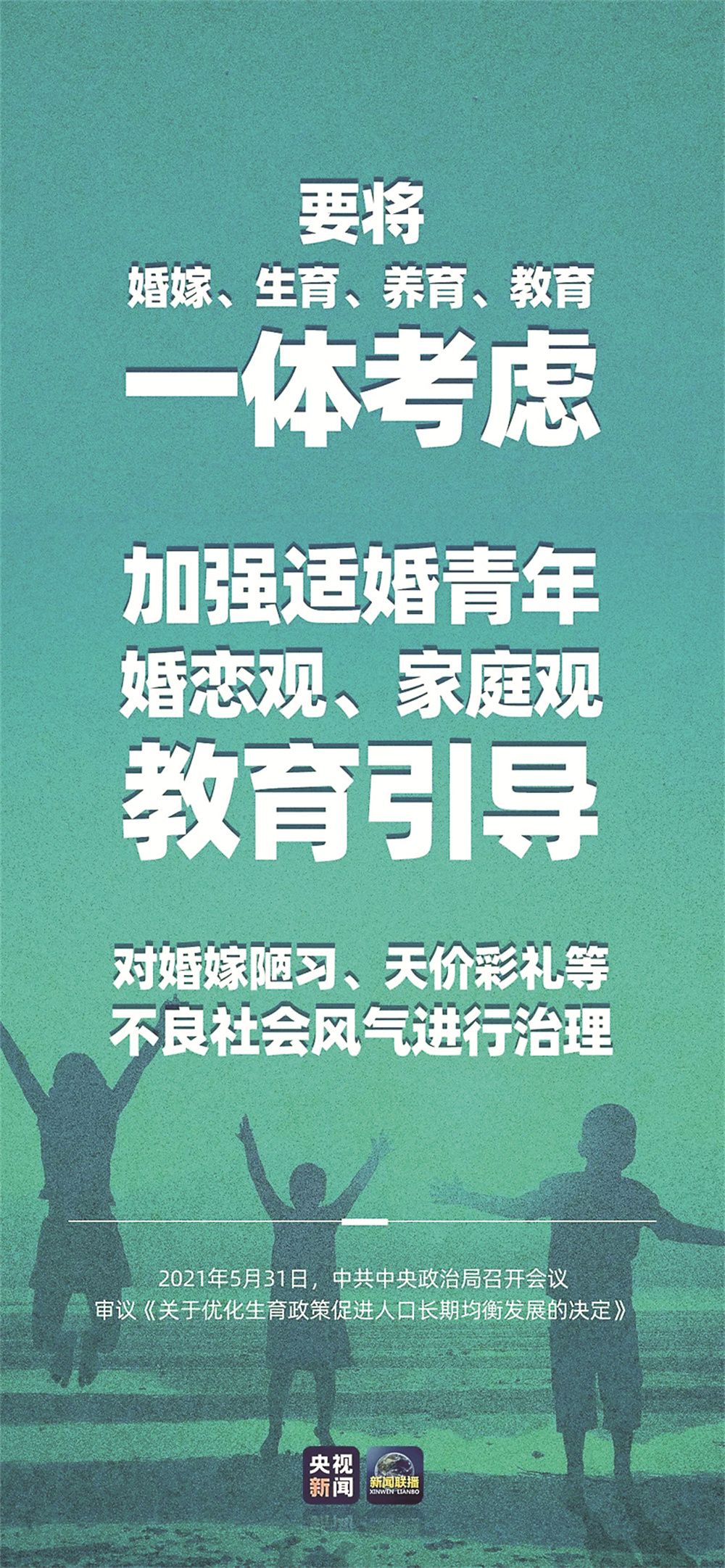 中共中央政治局5月31日召开会议,听取“十四五”时期积极应对人口老龄化重大政策举措汇报,审议《关于优化生育政策促进人口长期均衡发展的决定》,提出进一步优化生育政策,实施一对夫妻可以生育三个子女政策及配套支持措施。