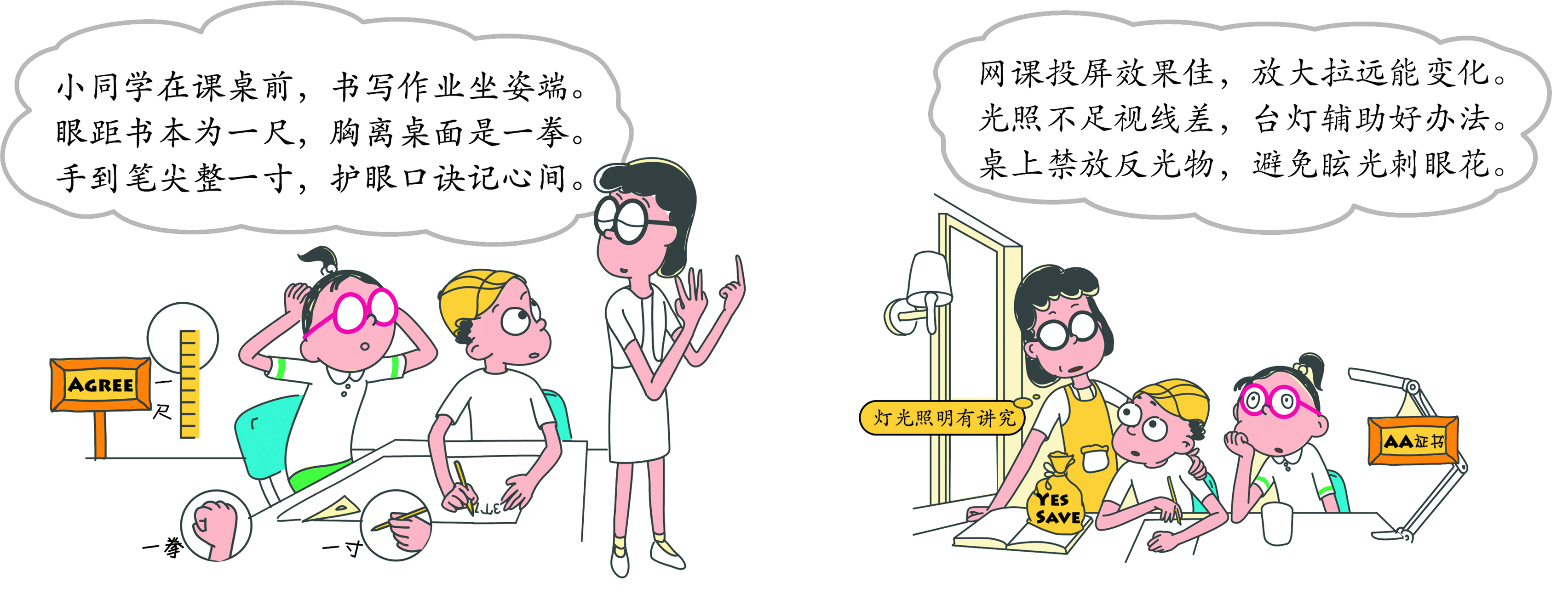 第一,自然疗法。保证每天日间课外活动两小时,最好是间断性的,这就需要孩子在课间休息时间,尽量多去户外活动。第二,20-20-20法则。每看近处20分钟,至少要看20英尺(6米)远的物体20秒。第三,正确的读书写字姿势。眼离书本一尺,握笔的手指离笔头一寸,胸部与书桌保持一拳的距离。第四,定期检查视力,建立视力发育档案。至少每年检查一次,及早发现眼屈光异常,提前干预。第五,控制在线学习时长。每天小学不超过两小时,初中不超过3小时,高中不超过4小时。
