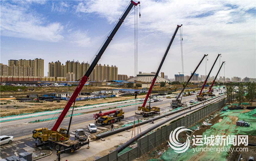5月31日,运城晋建热电有限公司在中心城区条山街西延长线进行供热管道入沟吊装作业。