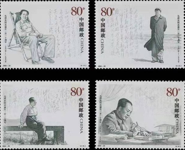 为纪念毛泽东同志诞辰110周年,国家邮政局2003年12月6日发行《毛泽东同志诞生一百一十周年》纪念邮票一套四枚,志号2003-25。邮票图案名称分别为:《毛泽东在西柏坡》(4-1)、《毛泽东在北戴河》(4-2)、《毛泽东在庐山》(4-3)、《毛泽东在广州》(4-4)。