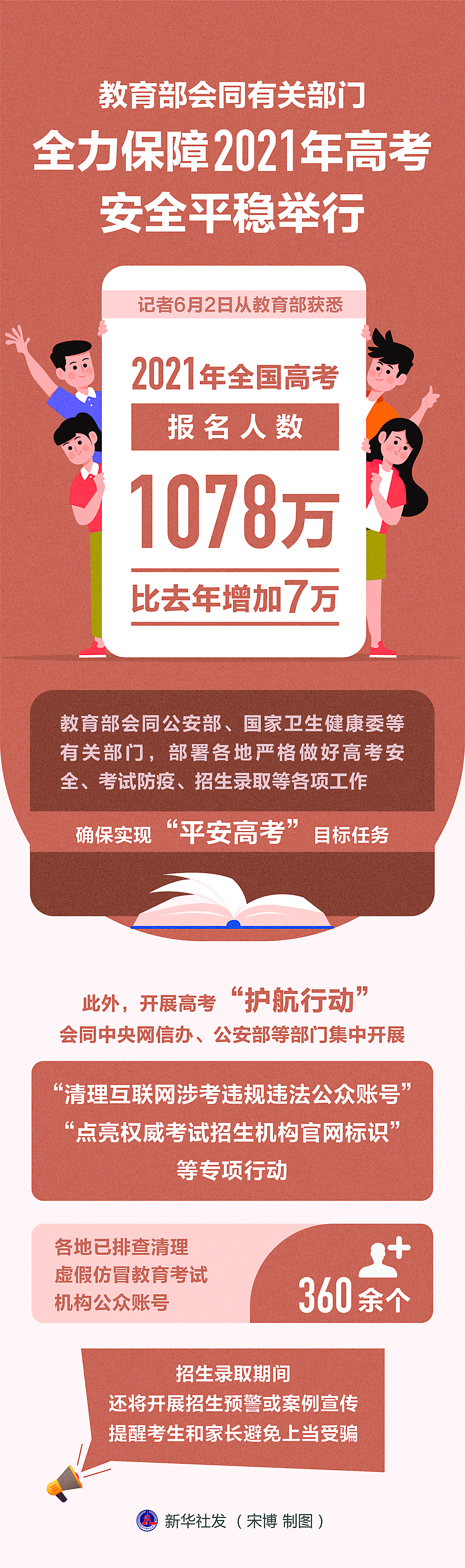 新华社北京6月2日电(记者 余俊杰)记者6月2日从教育部获悉,2021年全国高考报名人数1078万,比去年增加7万。教育部会同公安部、国家卫生健康委等有关部门,部署各地严格做好高考安全、考试防疫、招生录取等各项工作,确保实现“平安高考”目标任务。