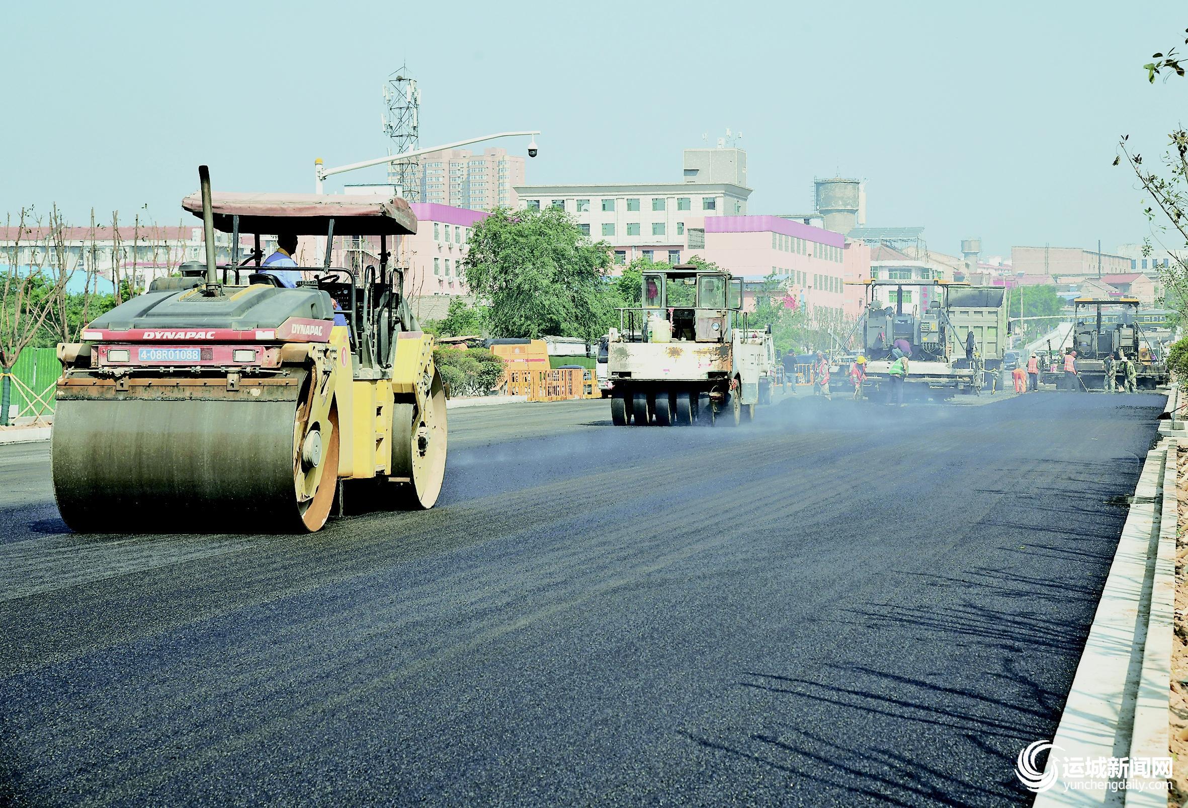 闻垣路县城段改造工程是闻喜县2021年城市建设重点工程之一,筑路工人在保障工程质量的前提下,加班加点施工,确保工程如期竣工。图为6月2日,工人在闻喜县闻垣路县城段铺筑路面。 特约摄影 温徐旺 摄