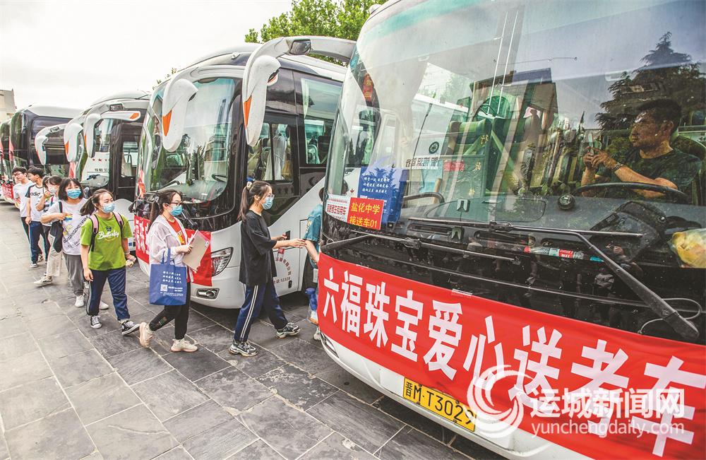6月7日,由爱心企业提供的爱心送考车一字排开,考生陆续上车,准备奔赴考场。