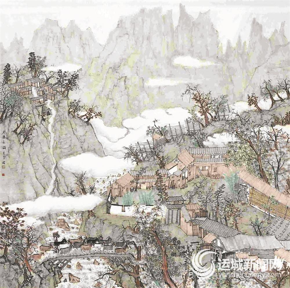 在画作的近处,佛手云在山间翻涌,流荡在村寨之中,仿佛时间定格在这吉祥、美好的一瞬间,表达了作者自己对迪庆州少数民族生活环境美好的愿望。画作在点和线之间塑造了立体感,整个画面显得层次感十足,这些丰富的层次将古老的建筑画出了现代社会的节奏感,有变化、有主次、有疏密,带给人强烈的美感。画作中还蕴含书法意味,别致风雅,又摒弃传统的双钩画法,使用了更适合的没骨法,不作墨线,直接用颜料画出了树木、绿植、盆栽,让画作更具冲击力,更具时代特征。