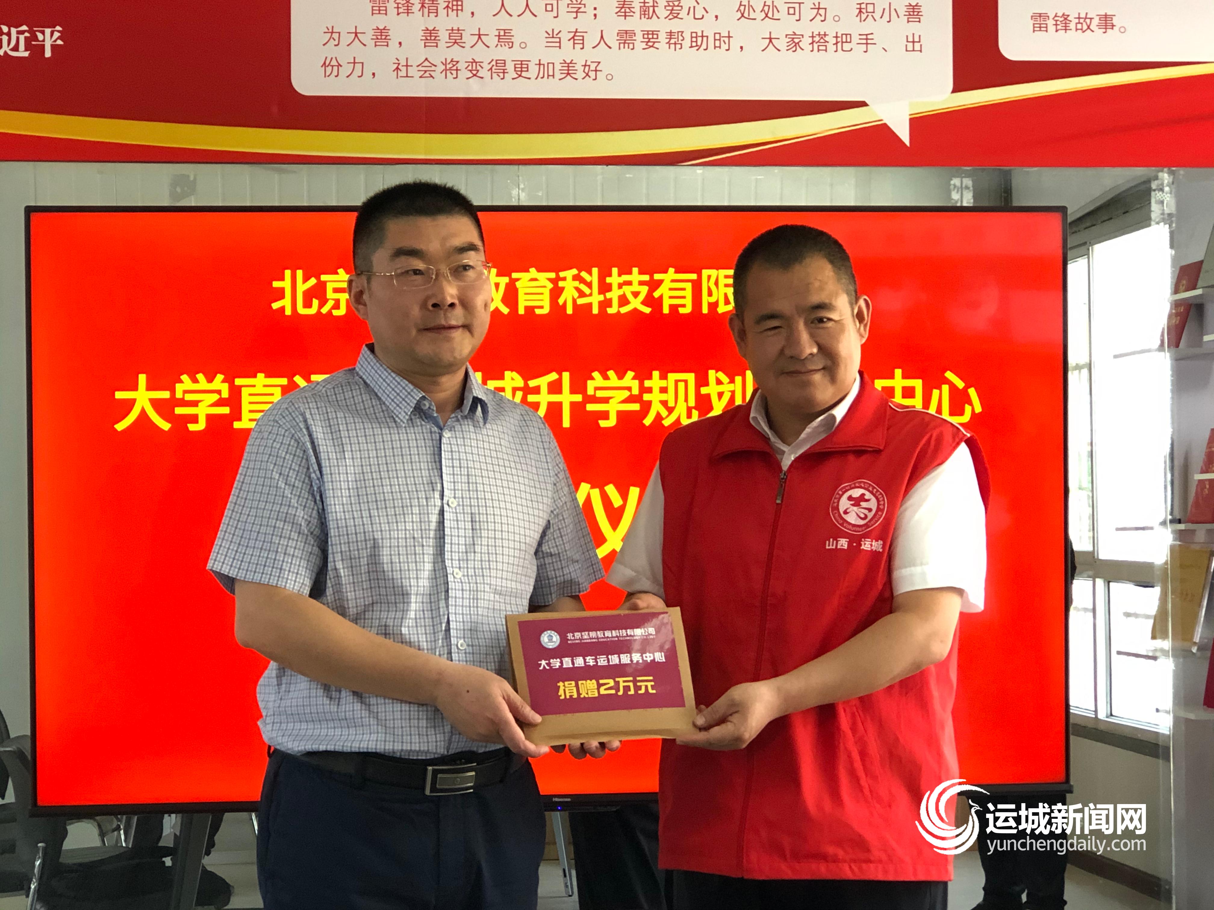 6月6日,韩征委托北京坚榜教育科技有限公司大学直通车运城升学规划服务中心负责人师义波,将两万元交到市第一时间爱心公益志愿者联合会会长张昌勤手中,还捐赠了“大学直通车”APP会员卡1万张。该卡可帮助考生线上填报志愿,输入成绩、喜欢的就学地区、专业等,APP会自动推荐符合的院校。对家庭特别贫困的考生,经市第一时间爱心公益志愿者联合会核实后,提供免费的线下高考志愿填报一对一服务。