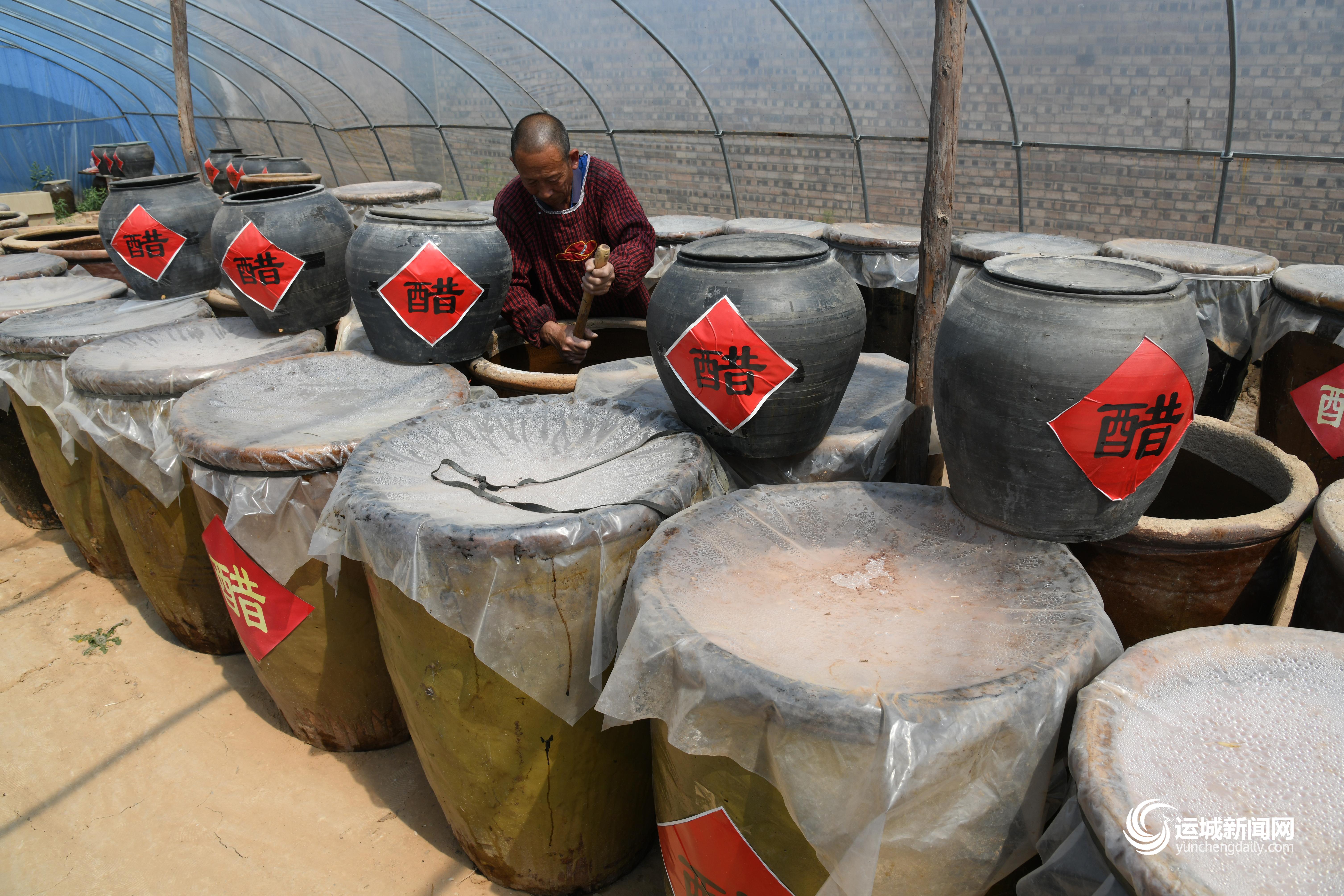 近日,闻喜县畖底镇上官张村60多岁的佀忠云,忙着在自家柿子醋(酒)作坊里,搅拌准备外销的柿子醋(酒)。经过1年的发酵,这些柿子醋(酒),闻起来酸味扑鼻,还有一股淡淡的酒香。