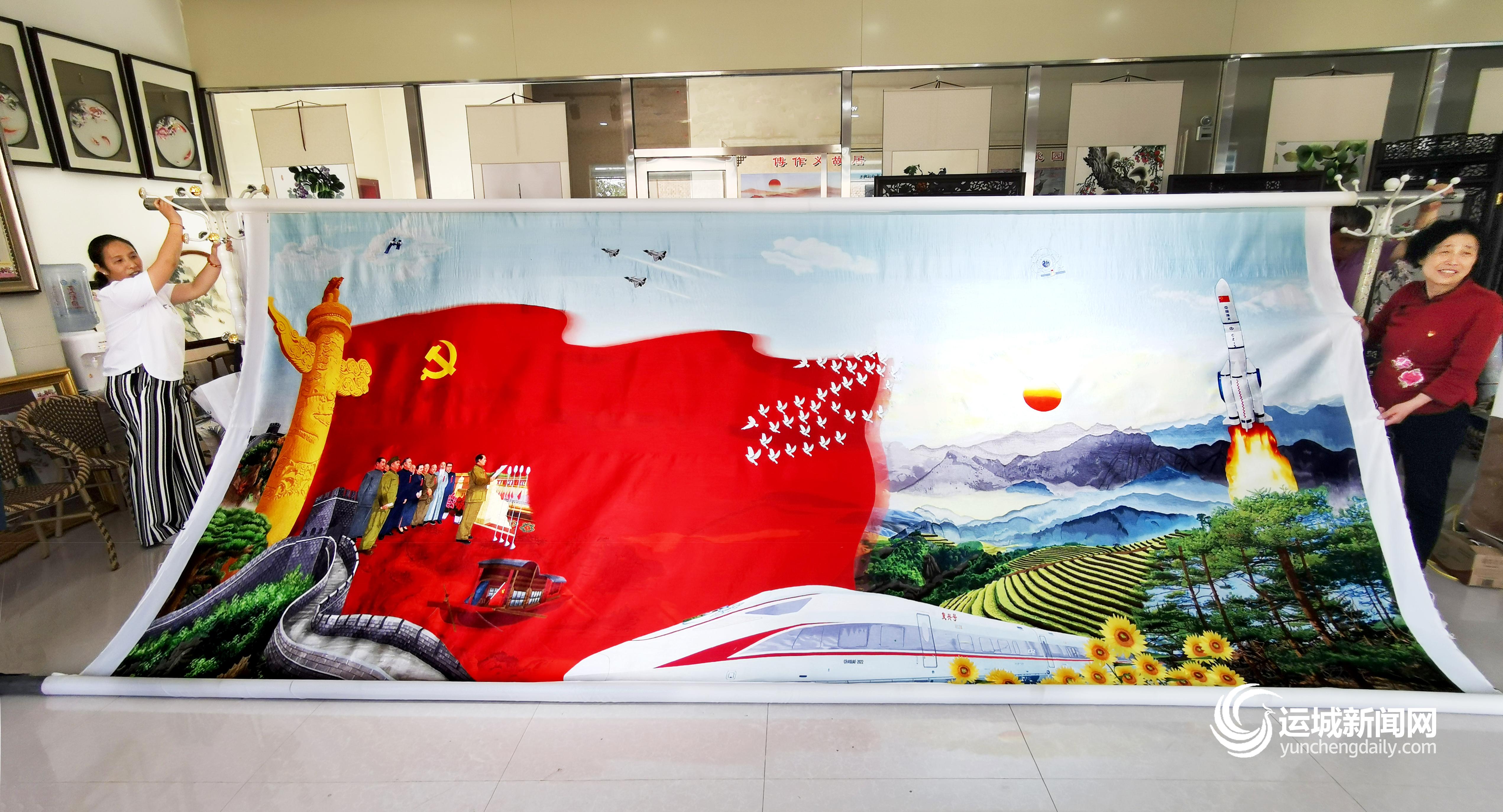 ▲6月7日,陈玉芳(右)和绣娘展示历时1年、精心绣制完成的《百年颂》作品。作品宽2.1米、长4.76米,以党旗的红色为基调,充分体现了全国人民在中国共产党领导下,中华民族从站起来、富起来到强起来的伟大飞跃。 临猗县爱润信绣艺有限公司绣坊、市级非遗文化传承人陈玉芳,从事刺绣行业已30多年。2020年5月,陈玉芳联合7名绣娘开始绣制《百年颂》,向建党100周年献礼。