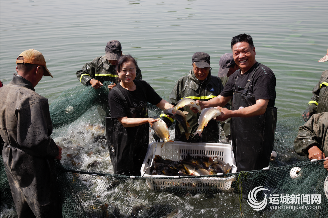 ▲6月1日,来自河南省郑州市的孔建国、吴智荣夫妇,在万荣县裴庄乡自家承包的鱼塘里,与工人一起撒网捞鱼。