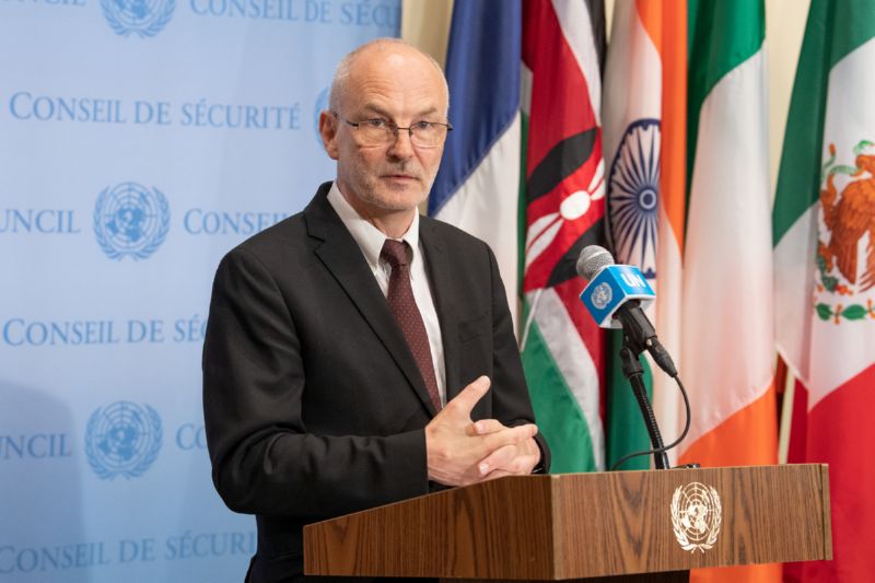 ▲6月8日,在位于纽约的联合国总部,爱沙尼亚常驻联合国代表斯文·于尔根松宣读安理会声明。联合国安理会成员8日以鼓掌方式一致通过决议,决定向联合国大会推荐古特雷斯连任联合国秘书长,任期自2022年1月1日至2026年12月31日。