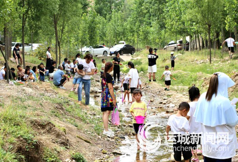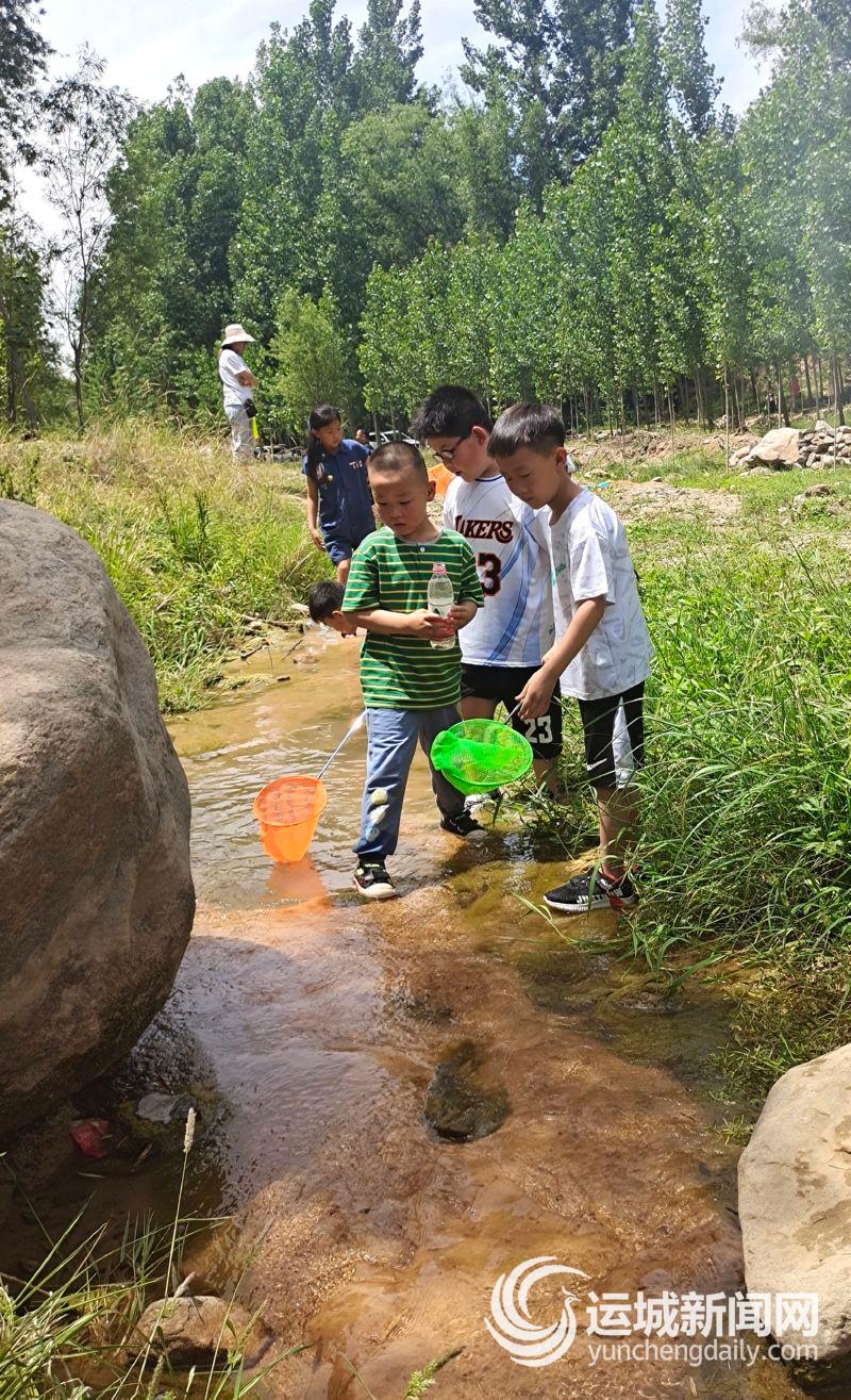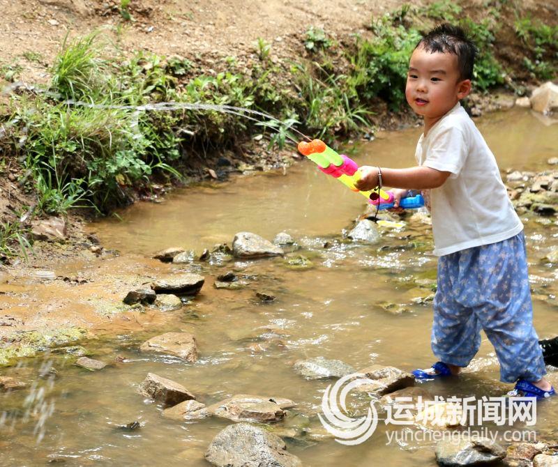 孩子们有的手持渔网,耐心搜寻河里的小鱼小虾,运气好的,还能抓到泥鳅;有的拿着水枪,组队“开战”,一不留神,就滋到了一旁休闲聊天的家长;有的什么工具也没带,干脆在浅浅的水里蹦一圈,或者撩起水花,加入“水战”队伍;还有腼腆的小孩儿蹲在小河边细细翻找不一样的小石头,为此行留个纪念。