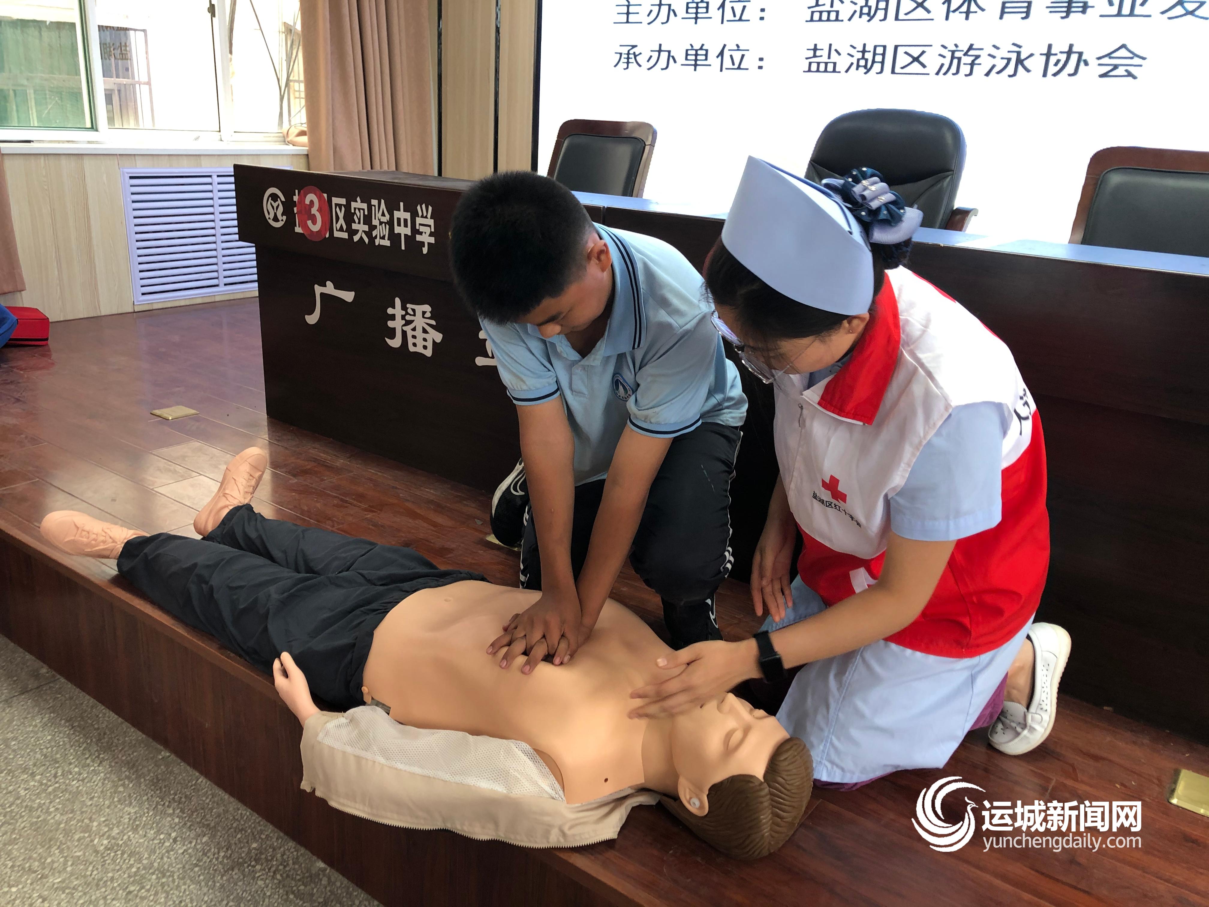 盐湖区游泳协会会长、盐湖区红十字应急救援志愿服务队队长王刚,详细讲解了溺水后如何急救等知识。盐湖区红十字会工作人员,利用“模拟人”现场教同学们实施心肺复苏(上图)。“这次活动让我受益匪浅,学到了非常实用的知识。”学生王奕霖说。