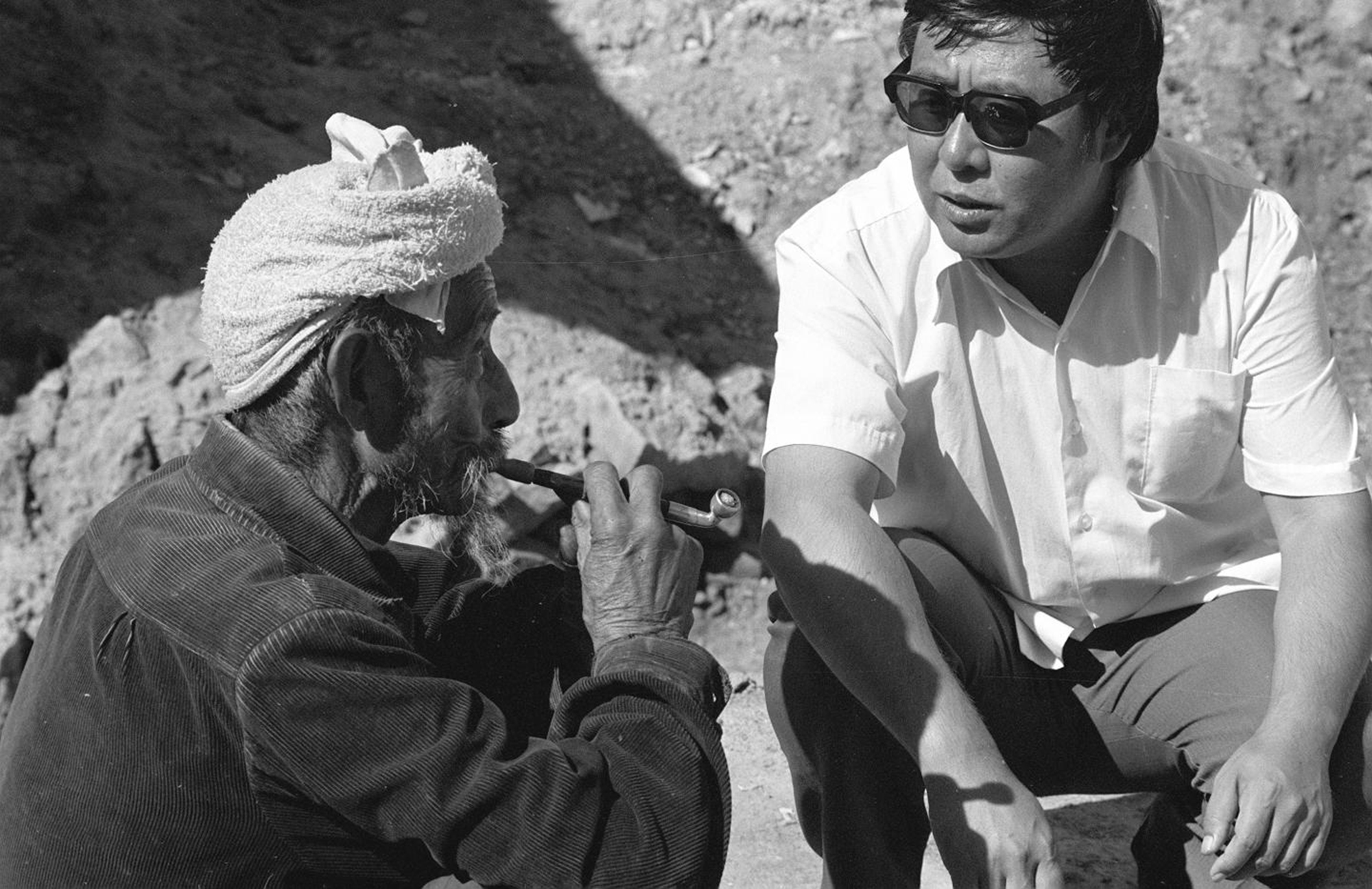 ▲路遥(右)在陕北农村采访 新华社记者 姚宗仪 摄