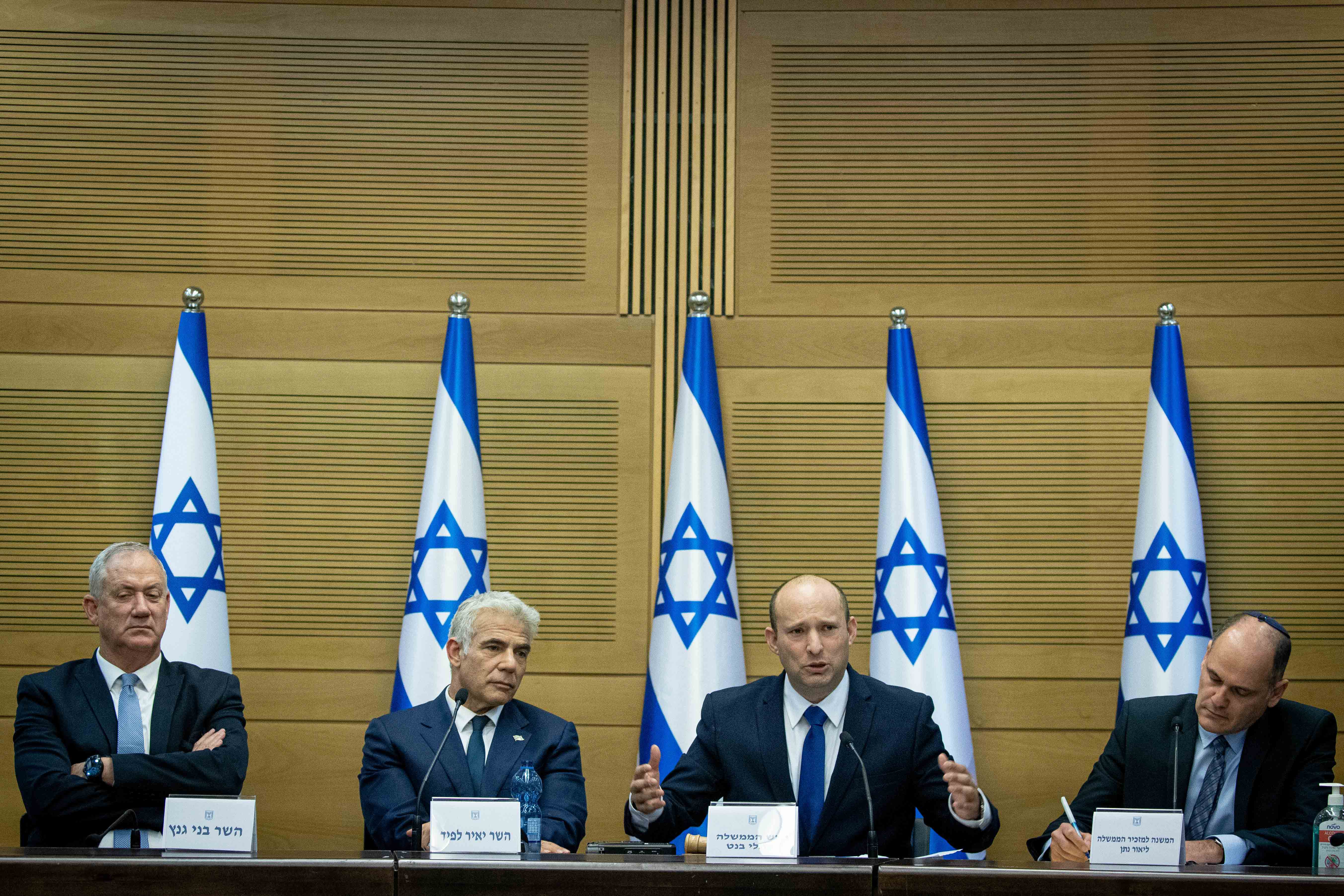6月13日,以色列新任总理贝内特(右二)和候补总理兼外交部长拉皮德(左二)在耶路撒冷参加新一届政府第一次内阁会议。 以色列新一届政府13日晚宣誓就职,统一右翼联盟领导人纳夫塔利·贝内特出任总理。新政府包括中左翼政党“拥有未来”党、统一右翼联盟、中间党派蓝白党等8个政党,是以色列历史上首个有阿拉伯政党参加的政府,结束了右翼政党利库德集团领导人内塔尼亚胡连续12年执政。新华社/基尼图片社