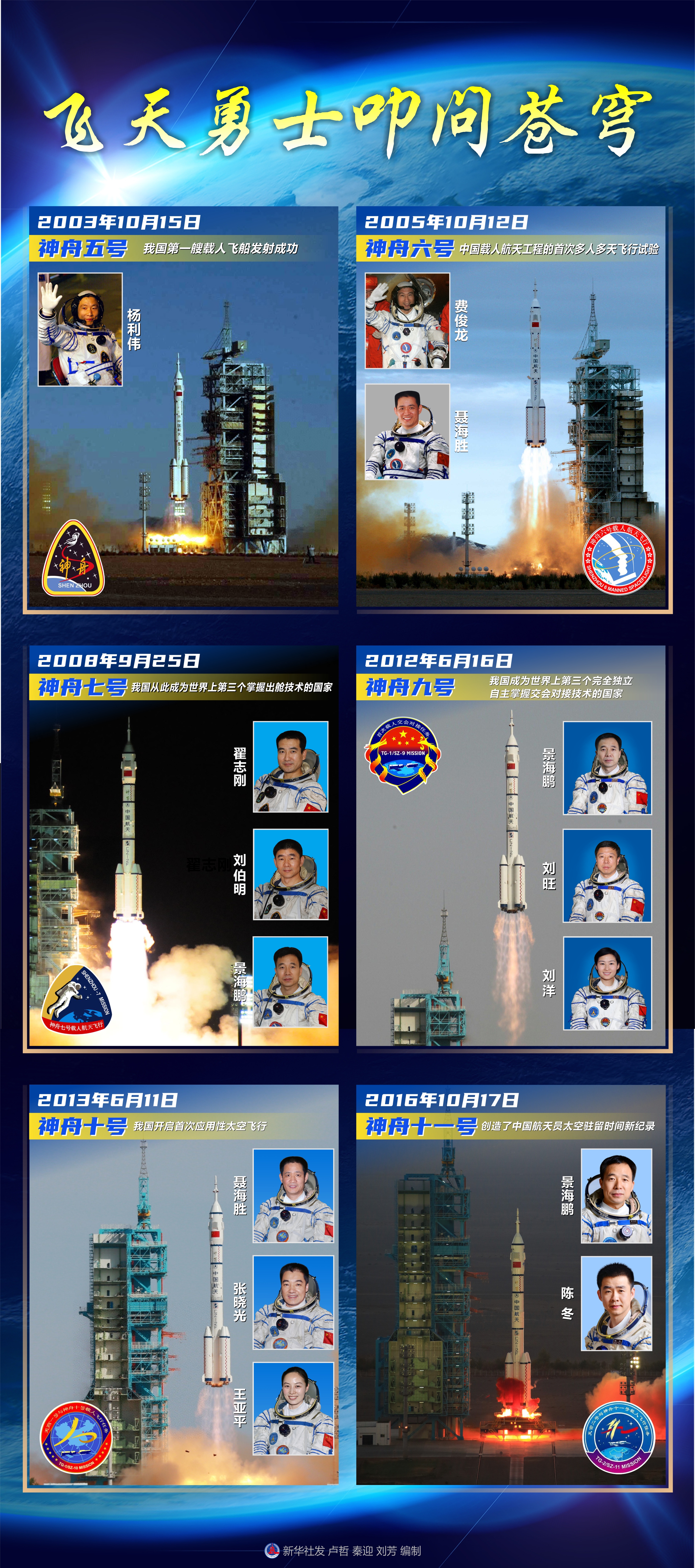 聂海胜,男,汉族,籍贯湖北枣阳,中共党员,博士学位。1964年9月出生,1983年6月入伍,1986年12月加入中国共产党,2014年6月任中国人民解放军航天员大队大队长,现为航天员大队特级航天员,专业技术少将军衔。曾任空军航空兵某师某团司令部领航主任,安全飞行1480小时,被评为空军一级飞行员。1998年1月入选为我国首批航天员。2003年9月,入选神舟五号飞行任务备份航天员。2005年10月,执行神舟六号飞行任务,同年11月被中共中央、国务院、中央军委授予“英雄航天员”荣誉称号,并获“航天功勋奖章”。2008年5月,入选神舟七号飞行任务备份航天员。2012年3月,入选神舟九号飞行任务备份航天员。2013年6月,执行神舟十号飞行任务,担任指令长,同年7月,被中共中央、国务院、中央军委授予“二级航天功勋奖章”。2019年12月入选神舟十二号飞行任务乘组,担任指令长。