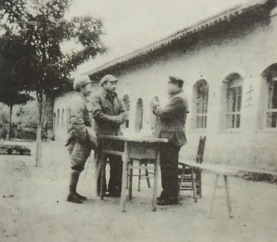 ▲1949年11月2日,贺龙同志向师生作“进军大西南”动员报告,休息时与安邑县县长(左二)、校政治部主任龙舒林(左一)谈话。 曹学针/摄