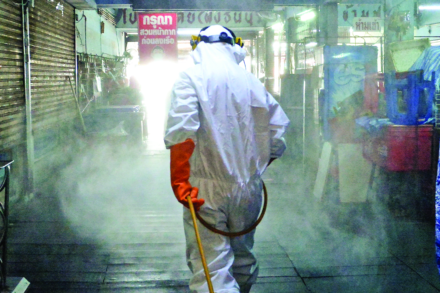 ▲6月21日,工作人员在泰国首都曼谷一处生鲜市场进行消毒。 泰国总理巴育日前表示,要尽快恢复在过去一年受新冠疫情影响的民生经济与旅游业。 新华社发(拉亨 摄)