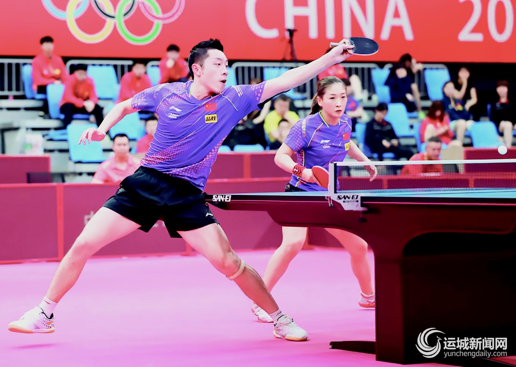 6月21日,许昕(左)/刘诗雯在混双比赛中。他们最终以4比1战胜中国香港组合黄镇廷/杜凯琹。 当日,在山东威海进行的中国国家乒乓球队备战东京奥运会热身赛混合双打循环赛中,许昕/刘诗雯以四轮全胜的战绩摘得冠军,林高远/张端、王楚钦/王曼昱分获第二、三名。 新华社发(中国乒协供图)