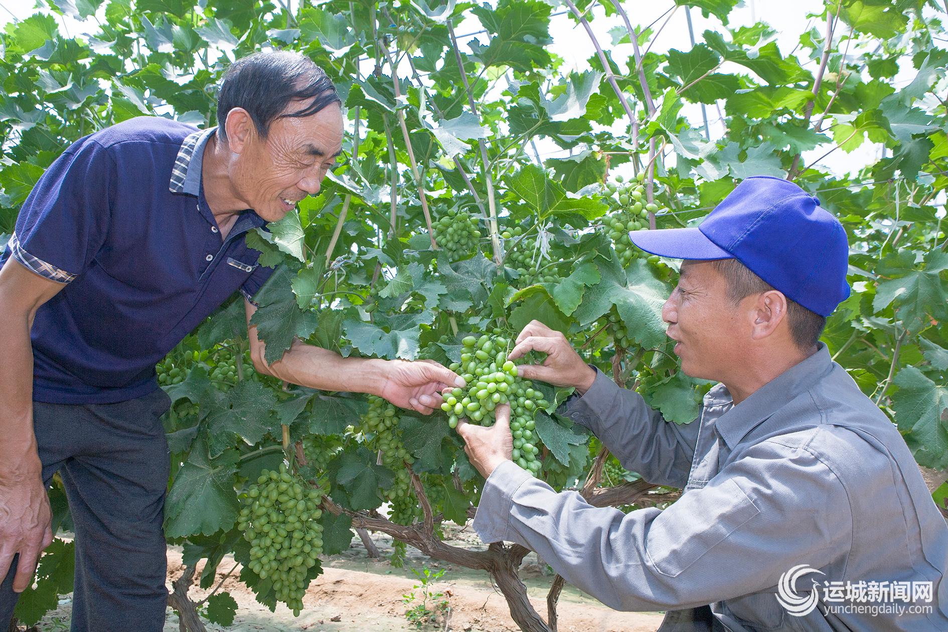 6月20日,万荣县东苏冯村共产党员许世伟(左)在包扶户许伟杰的葡萄园指导疏果。近年来,东苏冯村党支部、村委会在实施乡村振兴战略中将大棚葡萄产业作为村民致富的主导产业。在村党支部书记陈水朝个人投资120万元引进优种苗木、建设温室大棚供村民免费示范取得效益后,村党支部将46名党员全部分到30多个种植葡萄的推广户结对帮扶,带动全村种植葡萄户发展到140多家,总面积增加到130多亩,每户年增收5至7万元,村民年人均收入达2.5万元。 李克荣 摄