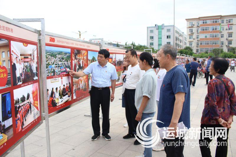 ▲6月23日,闻喜县人民广场上,多位党员和群众在观看庆祝建党100周年“学党史 传精神 跟党走”楹联书画摄影作品展。
