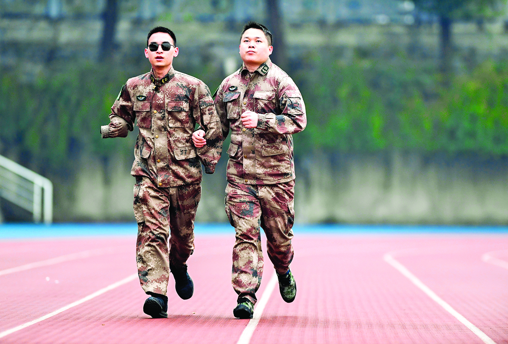 ▲2020年1月2日,“排雷英雄战士”杜富国(左)和战友在陆军军医大学操场上跑步。 新华社记者 王全超 摄