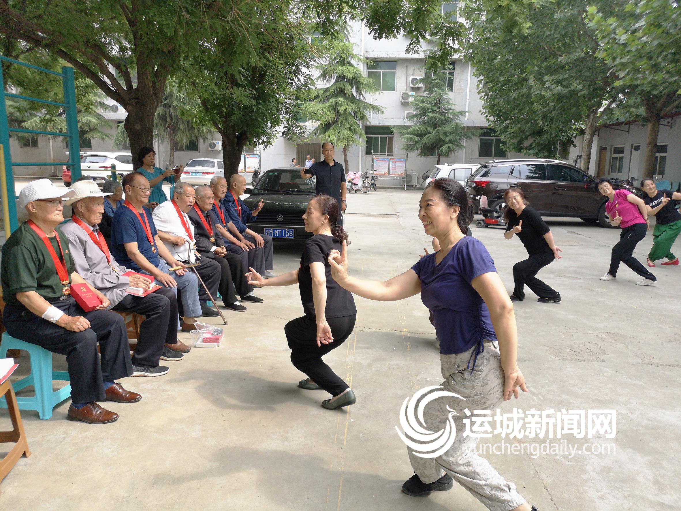 ▲6月25日,万荣县离退休干部文卫党支部领到“光荣在党50年”纪念章的老党员,在该县县委老干部局大院观看老年体协新韵舞蹈队的表演。 当日,该县离退休干部党总支所属各支部,将党中央为400多名老党员颁发的纪念章送到各自手中。同时,把纪念章发放同多种形式的党史学习教育结合起来,宣传党百年奋斗的光辉历史和伟大成就。特约摄影 李克荣