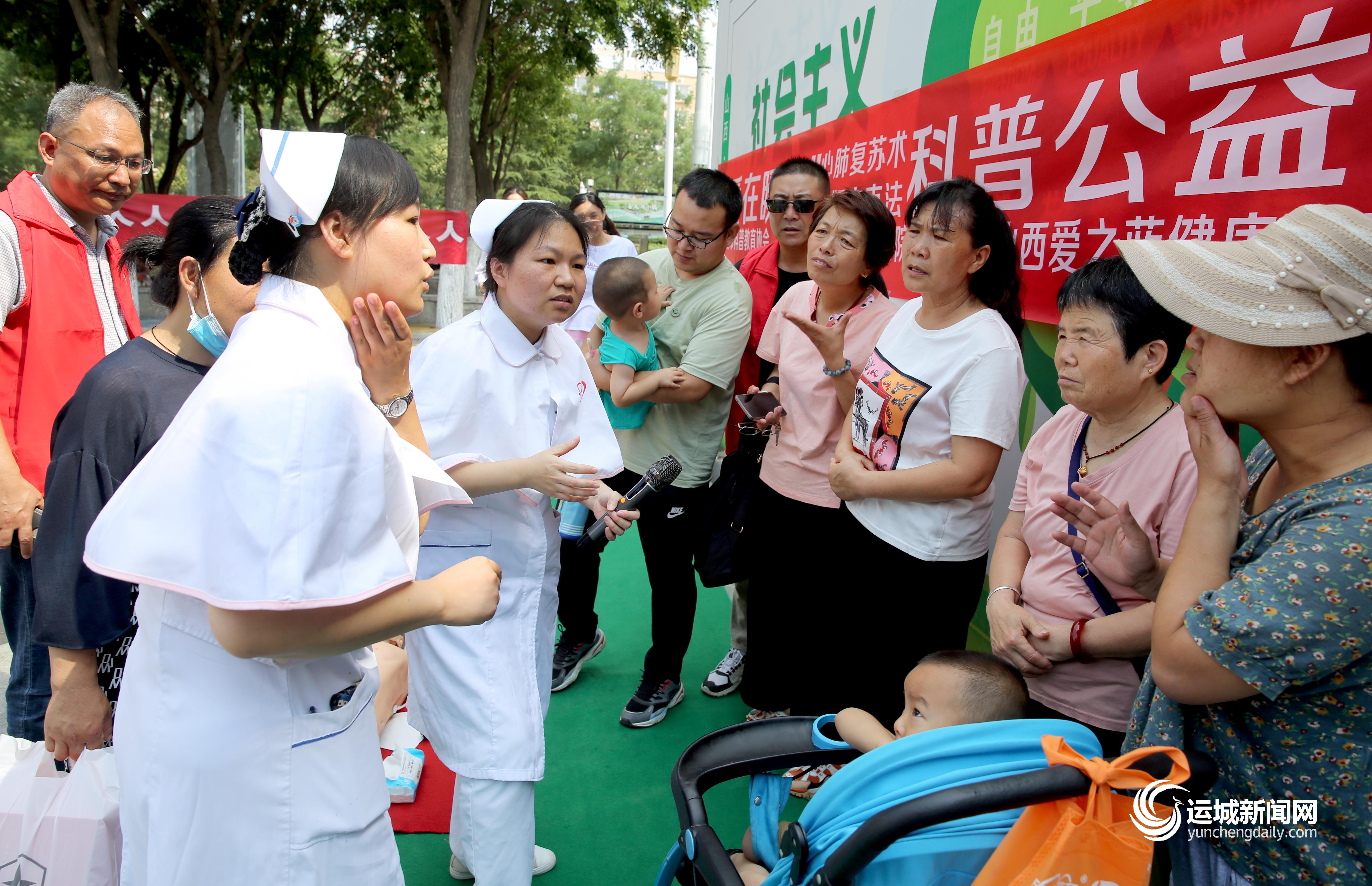 当天,运城市科普教育协会、市第一医院南院和山西爱之蓝健康管理公司,联合开展“爱在瞬间”科普公益行。医护人员和志愿者在市区航天公园门口,向市民传授心肺复苏、海姆立克法等急救技能。